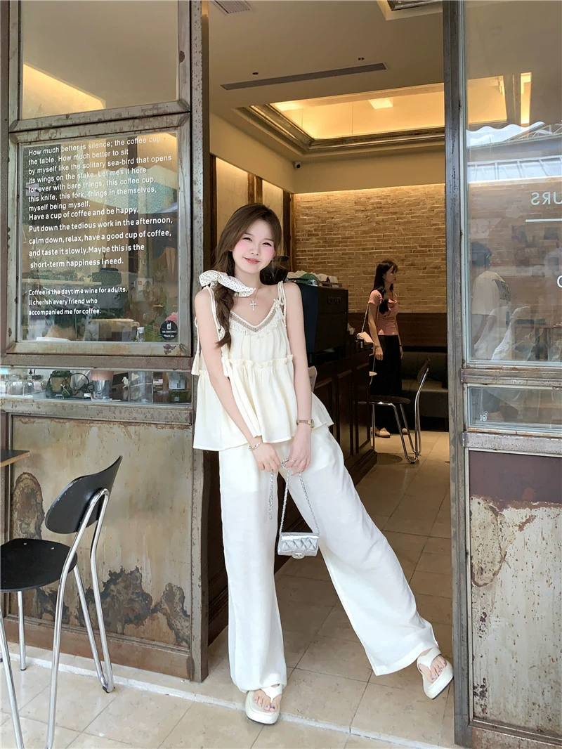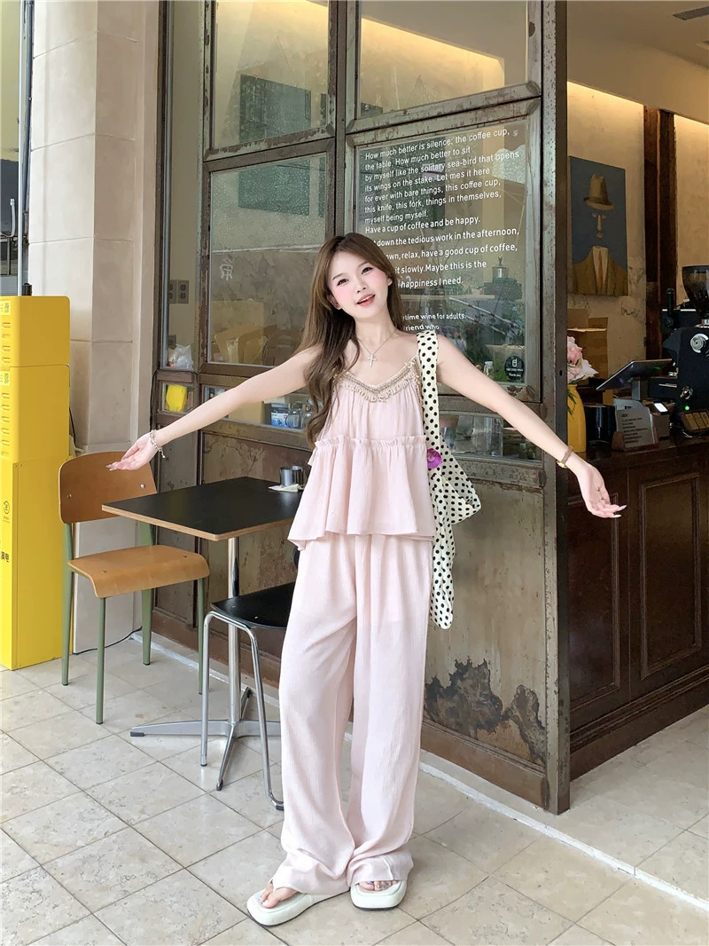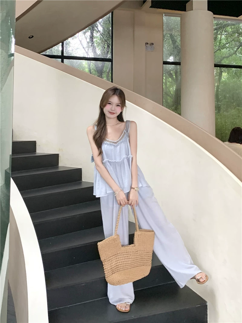 | nameOriginal | Resort style blue fringed casual pants with V-neck suspenders |