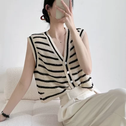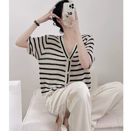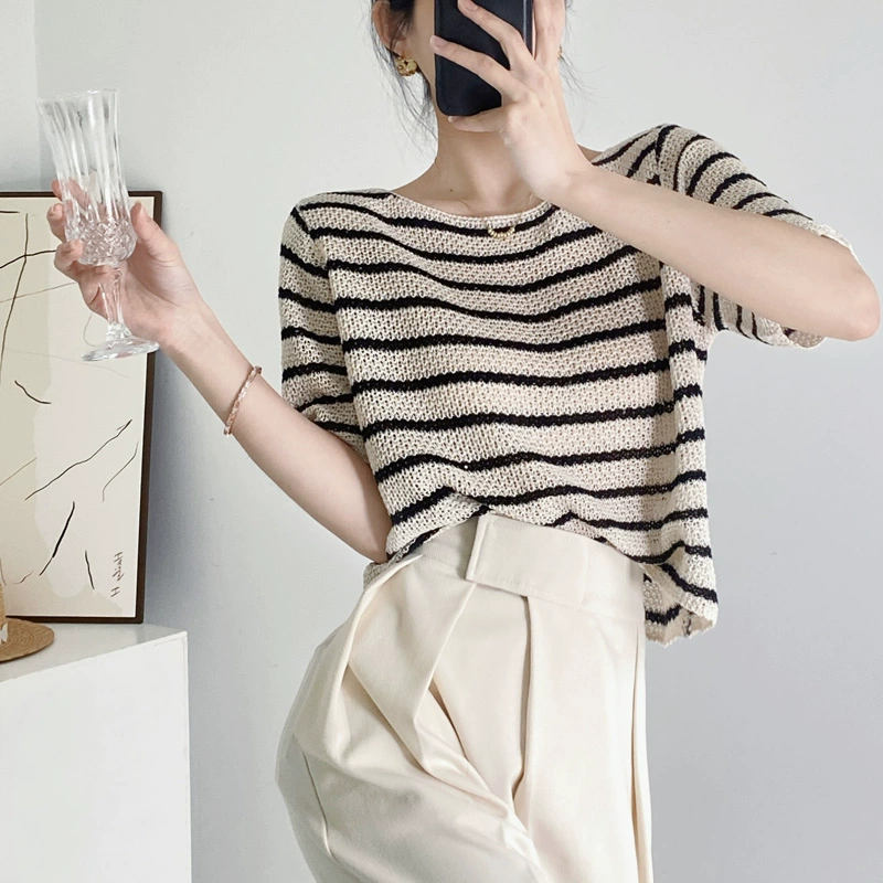 | nameOriginal | Resort style contrast color ice silk hollow sweater thin short sleeves |