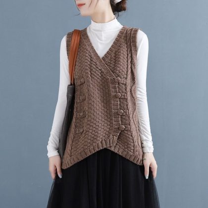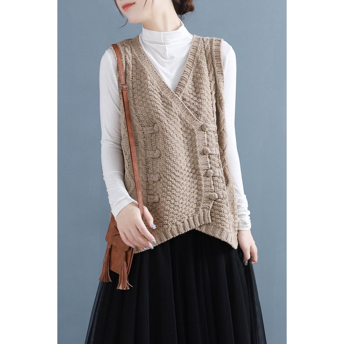 | nameOriginal | Retro artistic buckle double-breasted knitted vest for women Autumn New sleeveless V-neck wool vest base |