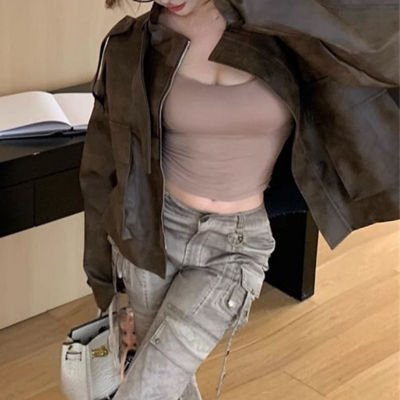 | nameOriginal | Retro brown motorcycle leather coat women's autumn new versatile short loose jacket |