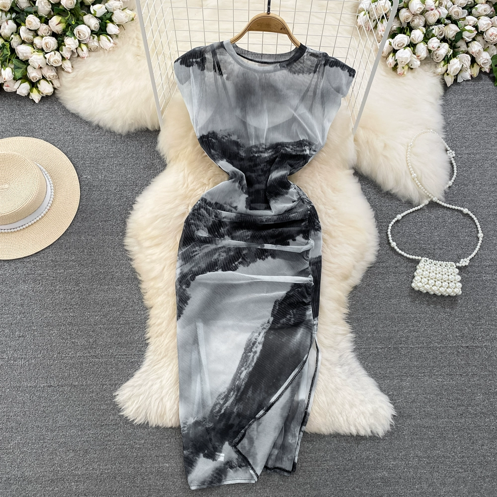 | nameOriginal | Retro Chinese style round neck smudged print dress mesh |