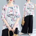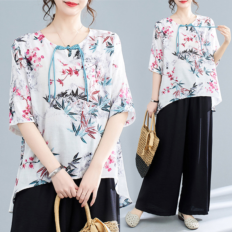 | nameOriginal | Retro Ethnic Style Round Neck Printed Top with Buckle Loose Five-point Sleeve Cotton and Linen Wide-leg Pants Set Two-piece Set |