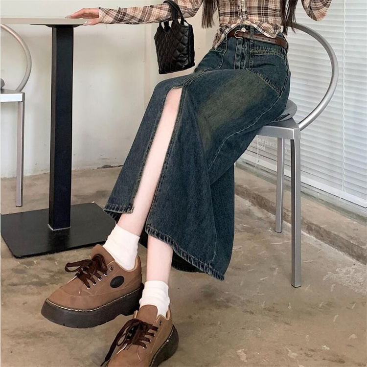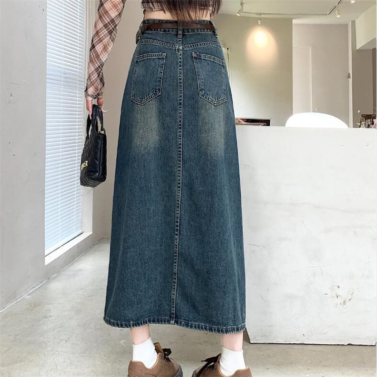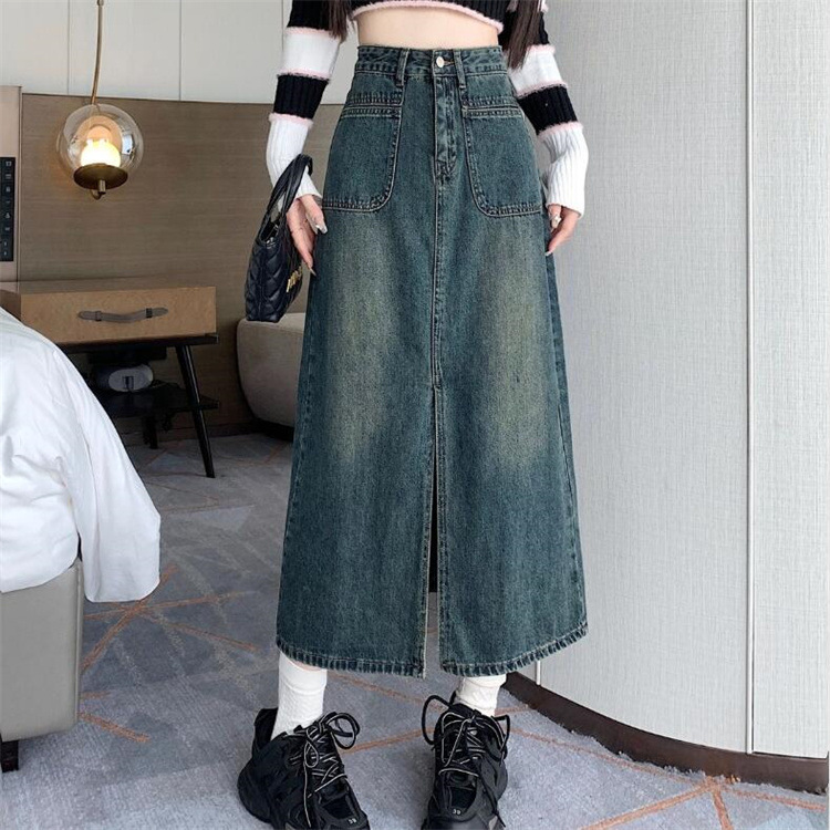 Retro front pocket Denim skirt women's small new high waist mid-length a-line split one-step skirt