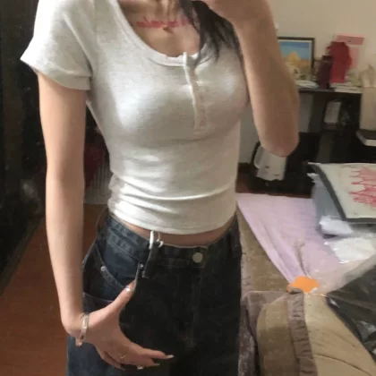 | nameOriginal | Retro Gray U Neck Women's Summer Slim Short Sleeve T-Shirt |