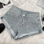 Retro heavy-waisted denim shorts with rolled hems and rhinestones