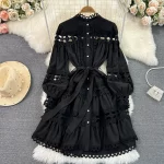 فستان ريترو فانوس بأكمام طويلة مع ربطة عنق