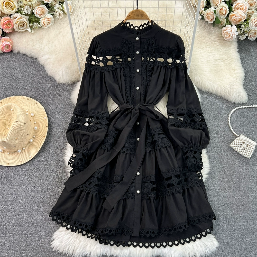 Retro Lantern Long Sleeve Dress with Bow Tie