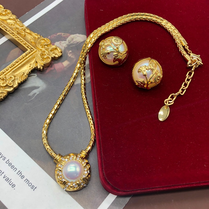 | nameOriginal | Retro palace style copper chain gold-plated light luxury horse color shell rhinestone necklace carved pattern design ear studs suit |