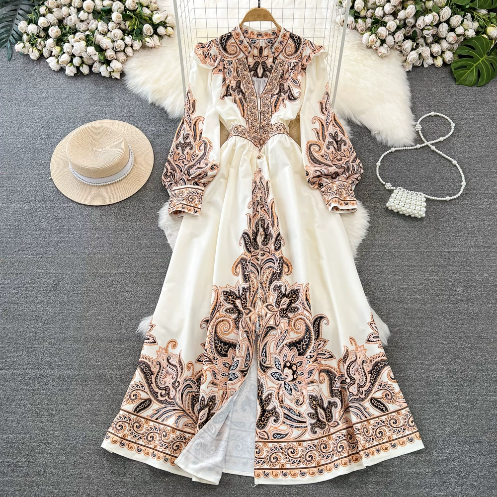 Retro palace-style lantern sleeves, stand-up collar, waisted A-line single-breasted celadon positioning print dress