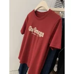 Retro shoulder embroidered loose slimming short-sleeved T-shirt