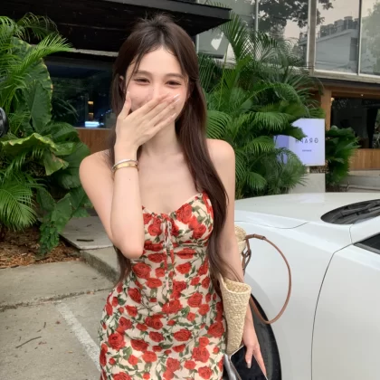 تنورة صيفية رفيعة بحمالات ريترو مع طباعة وردية