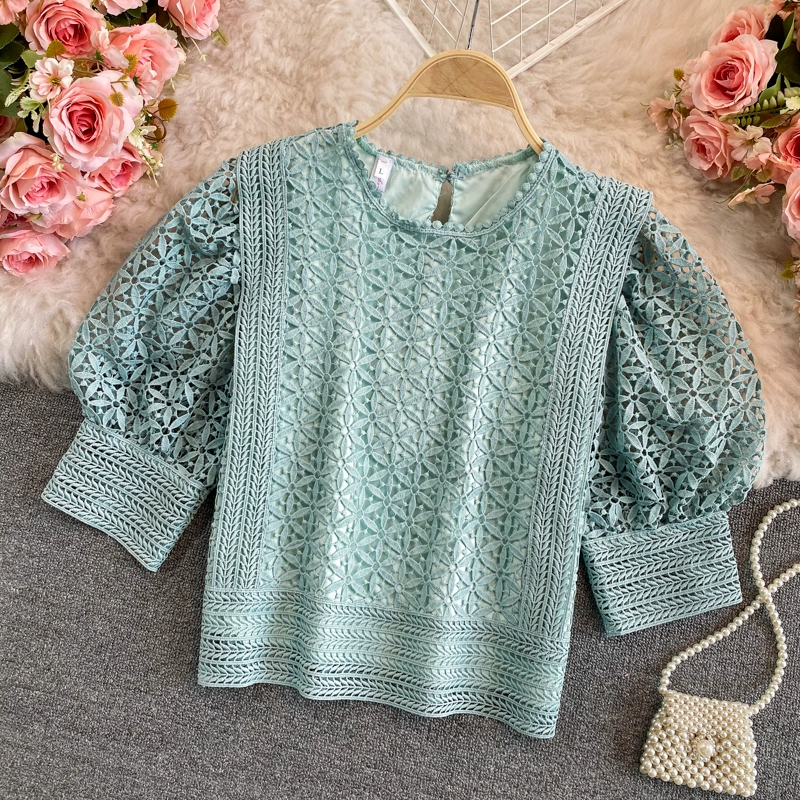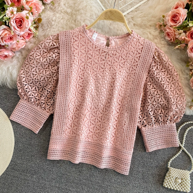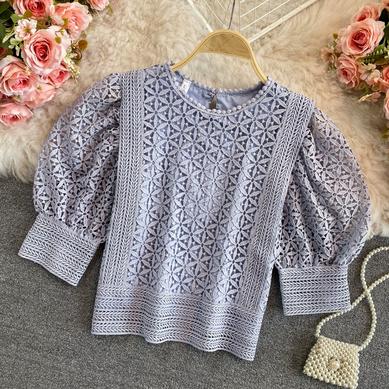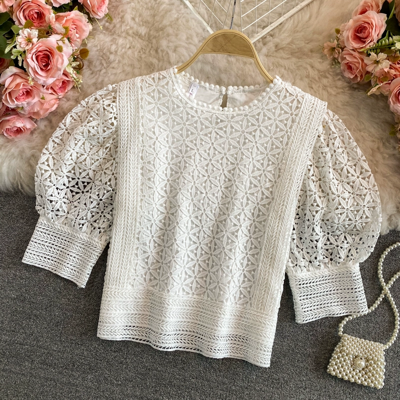 | nameOriginal | Retro three-quarter sleeve round neck water-soluble lace top with crochet pattern |