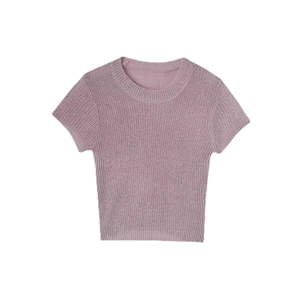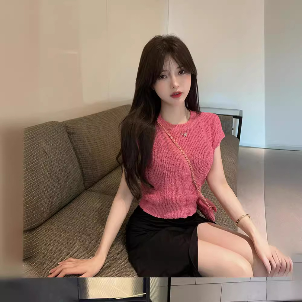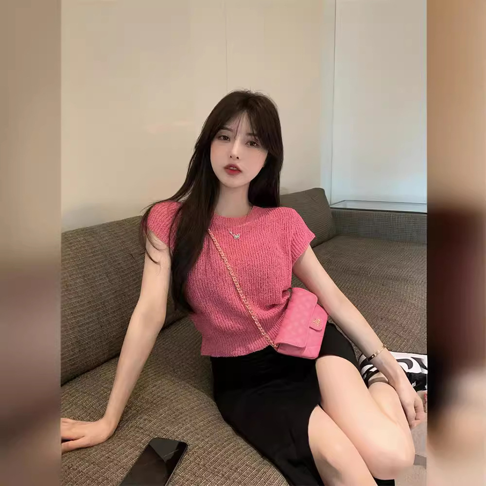Rose Pink Short-sleeved Sweater Women's Summer Thin 2024 Design Niche Sleeveless Slim-fit Short Top