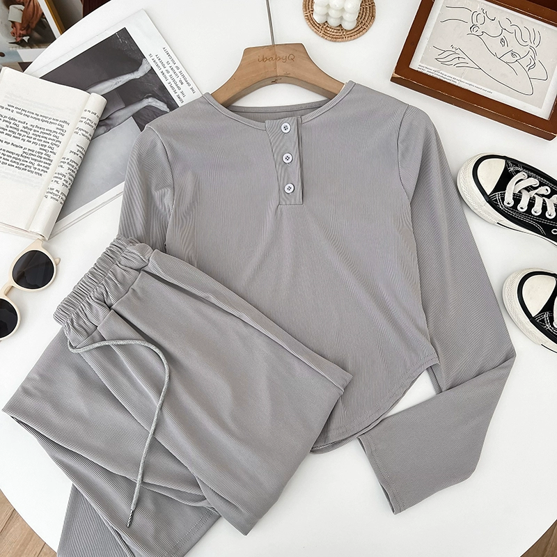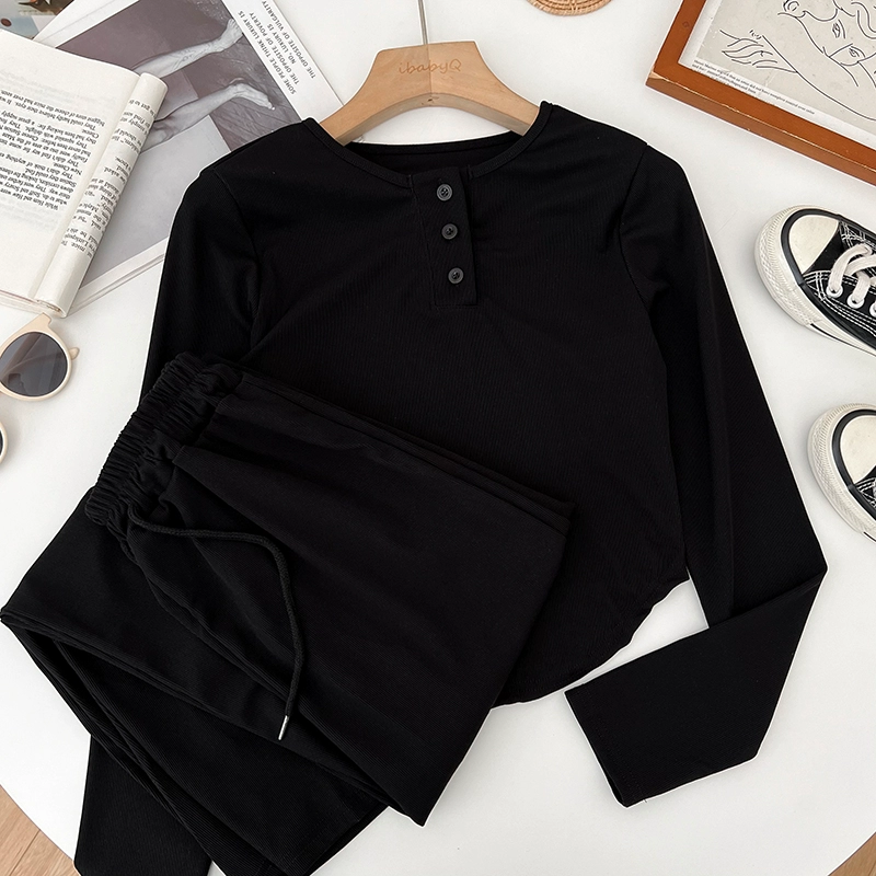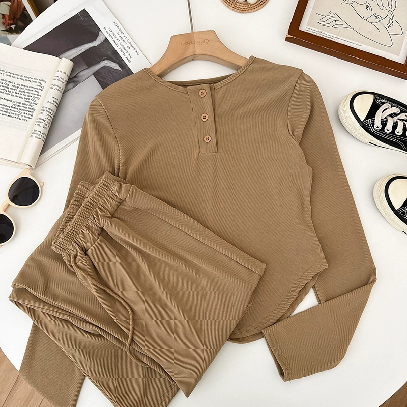| nameOriginal | Round neck single-breasted irregular long-sleeved T-shirt top + drawstring elastic waist wide-leg pants casual pants two-piece set for women |