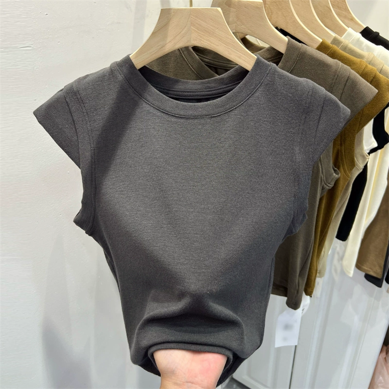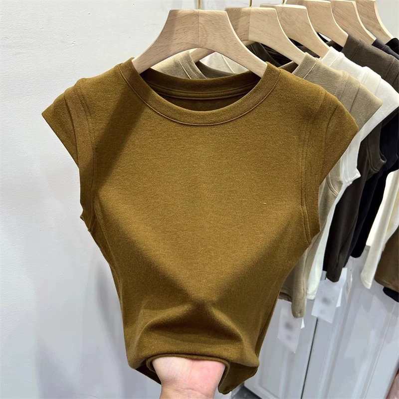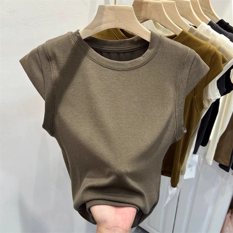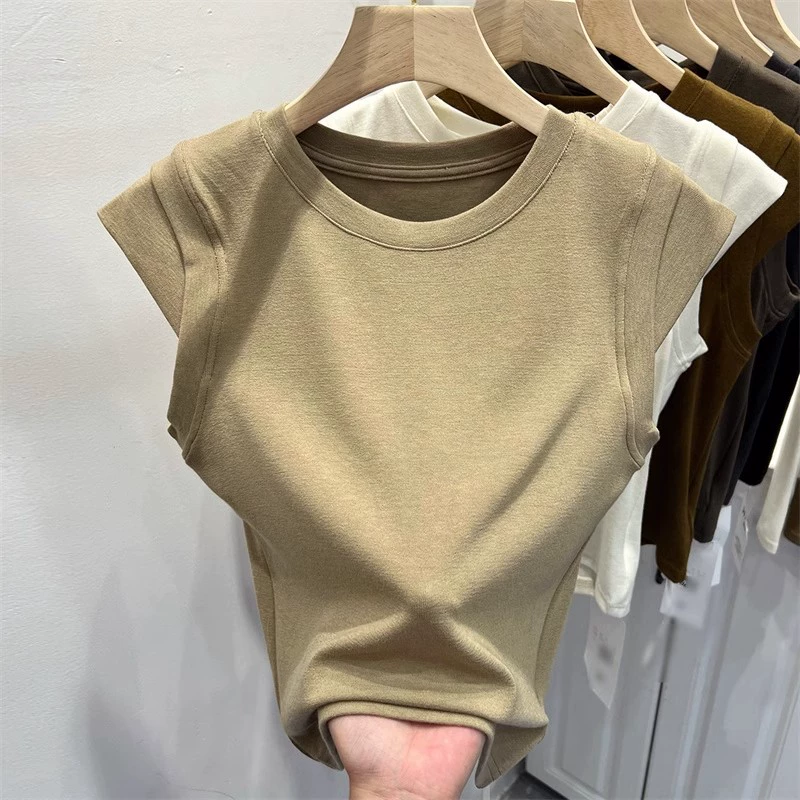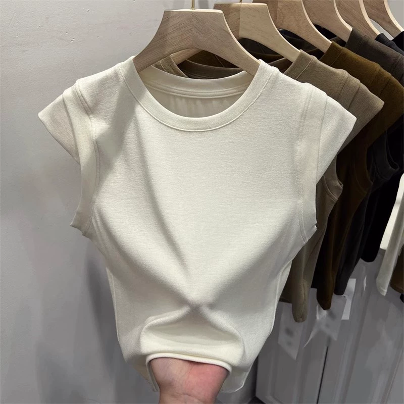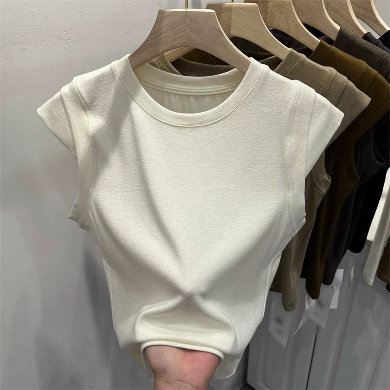 Round neck slim fit simple sleeveless soft waxy knitted T-shirt