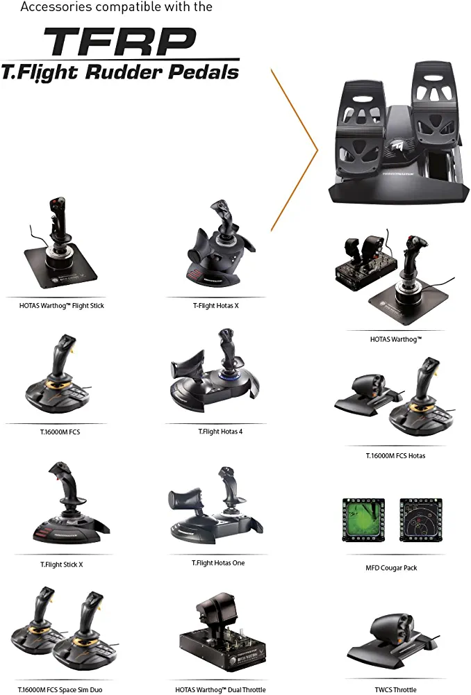 يحتوي TFRP على اتصال USB و/أو RJ12 خاص ويعمل مع جميع أذرع التحكم في السوق بفضل برامج تشغيل Thrustmaster على جهاز الكمبيوتر (Windows 10/8/7/Vista). كما أنه متوافق مع جميع الألعاب التي تدعم منافذ USB المتعددة والدفات على الكمبيوتر الشخصي وعلى PS4، ويتصل مباشرة بعصا التحكم Thrustmaster T.Flight Hotas 4. عصا التحكم الرسمية لـ PlayStation 4 متوافقة أيضًا مع الكمبيوتر الشخصي (تُباع بشكل منفصل). قم بتنزيل برامج التشغيل من موقع ts.thrustmaster.com.