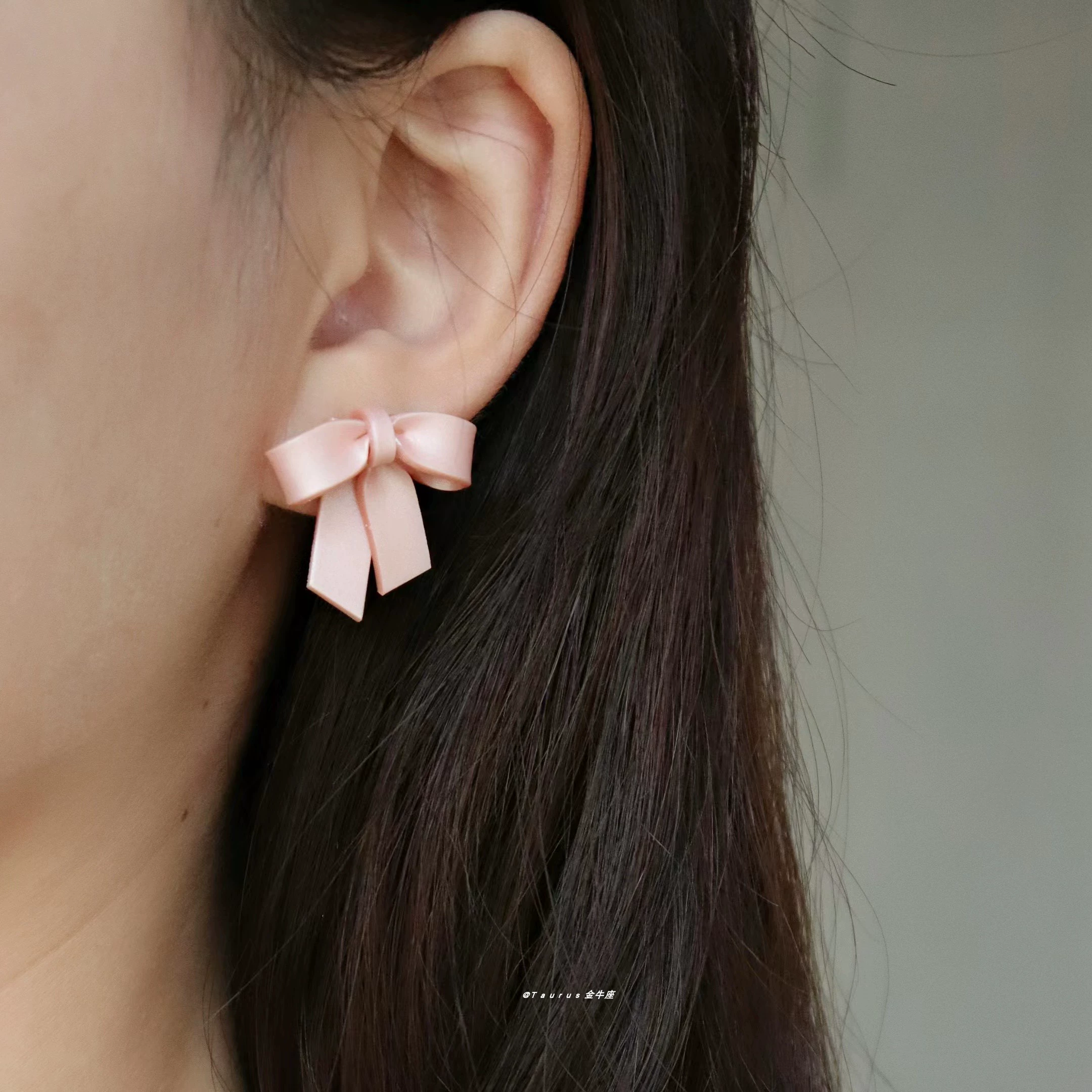 s925 silver bow earrings ins style earrings niche design handmade soft pottery earrings ear clips Chinese Valentine's Day gift