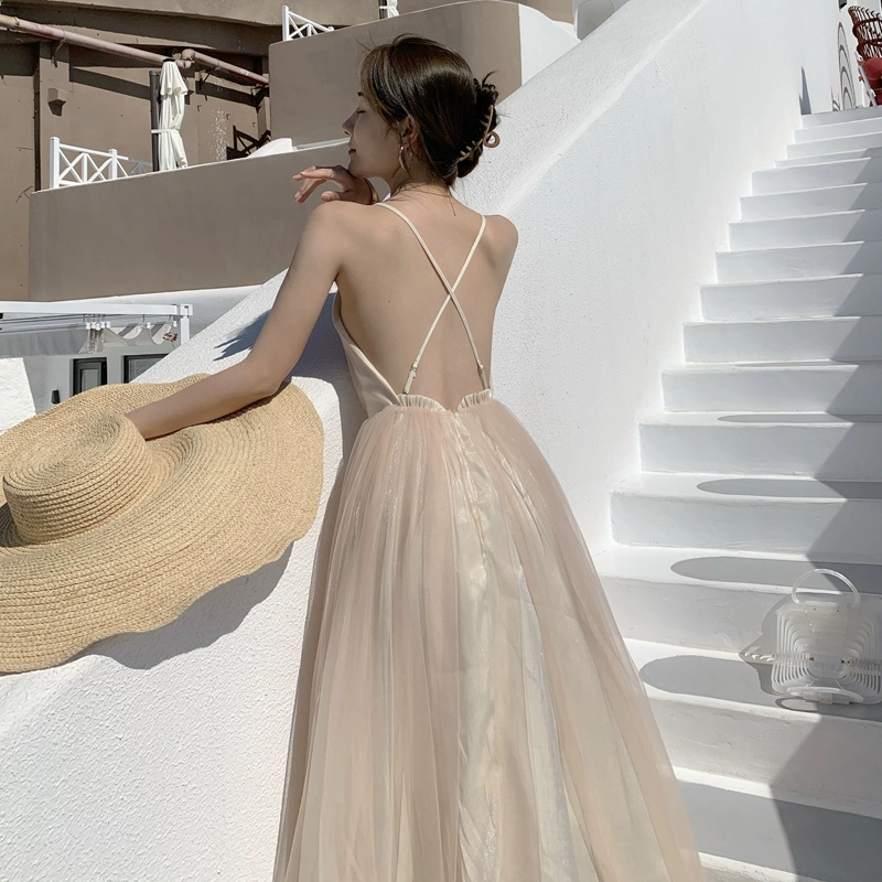 | nameOriginal | Sanya seaside vacation travel dress super fairy mesh suspender backless long skirt waist slimming beach skirt |