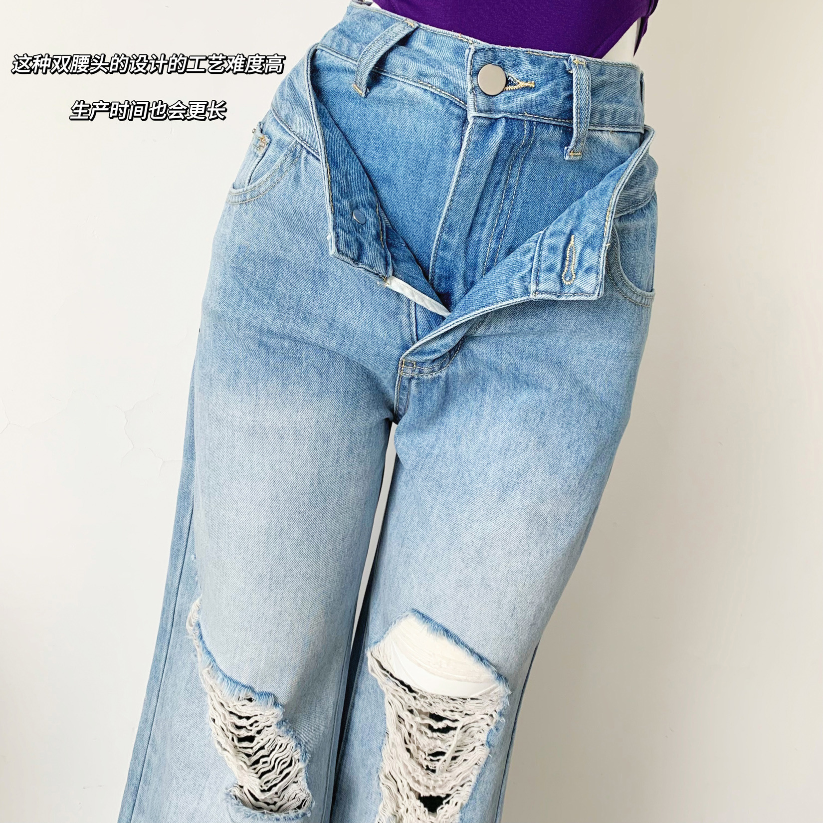 | nameOriginal | Self-focus! Double Waist Design Blue Low Waist Ripped Straight Jeans |