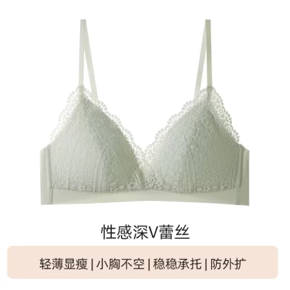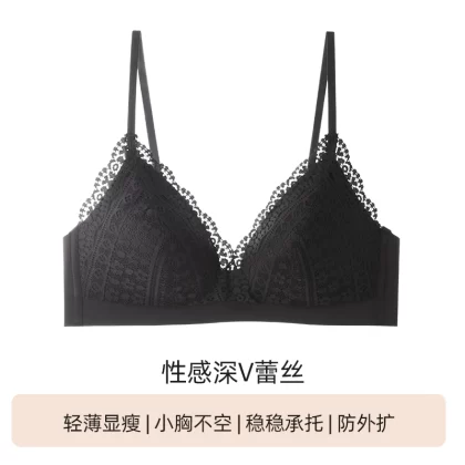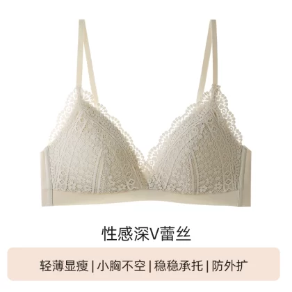 | nameOriginal | Sexy triangle cup underwear for women in summer, thin, small breasts, gathered and not empty cup, French lace deep V low-cut bra |