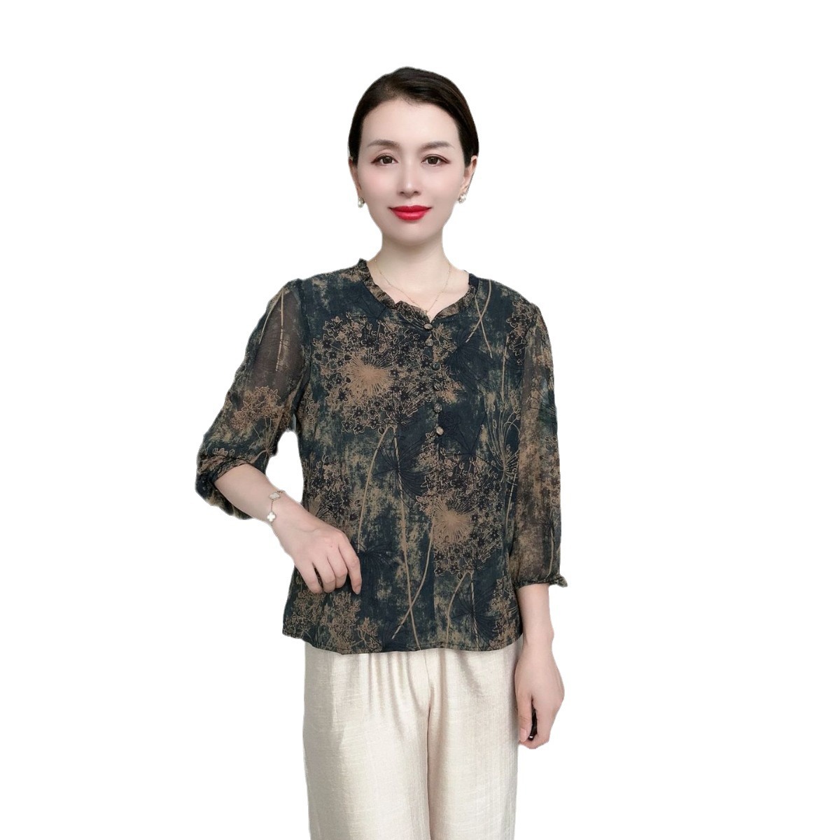 | nameOriginal | Shirt Women's Summer Mother's Dress Seven-Sleeve Printed Shirt with Ear Collar Age-Reducing plus size Shirt |
