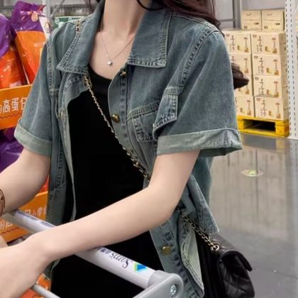 Short Denim Coat Design Niche Women's Thin American-style Retro Small All-match Collar Short-sleeve Top
