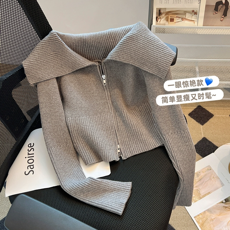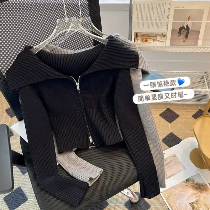 nameOriginal | Short double zip collarbone one shoulder knitted cardigan |