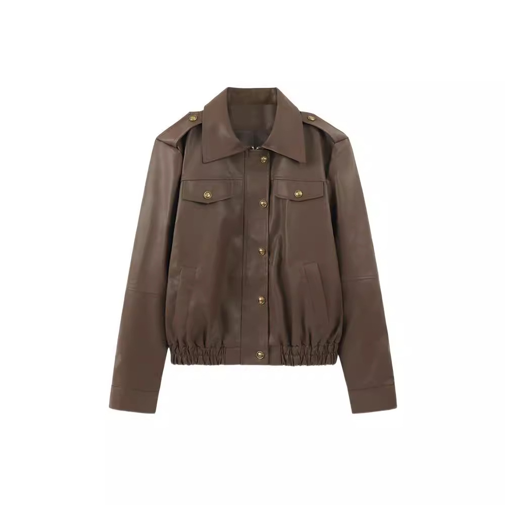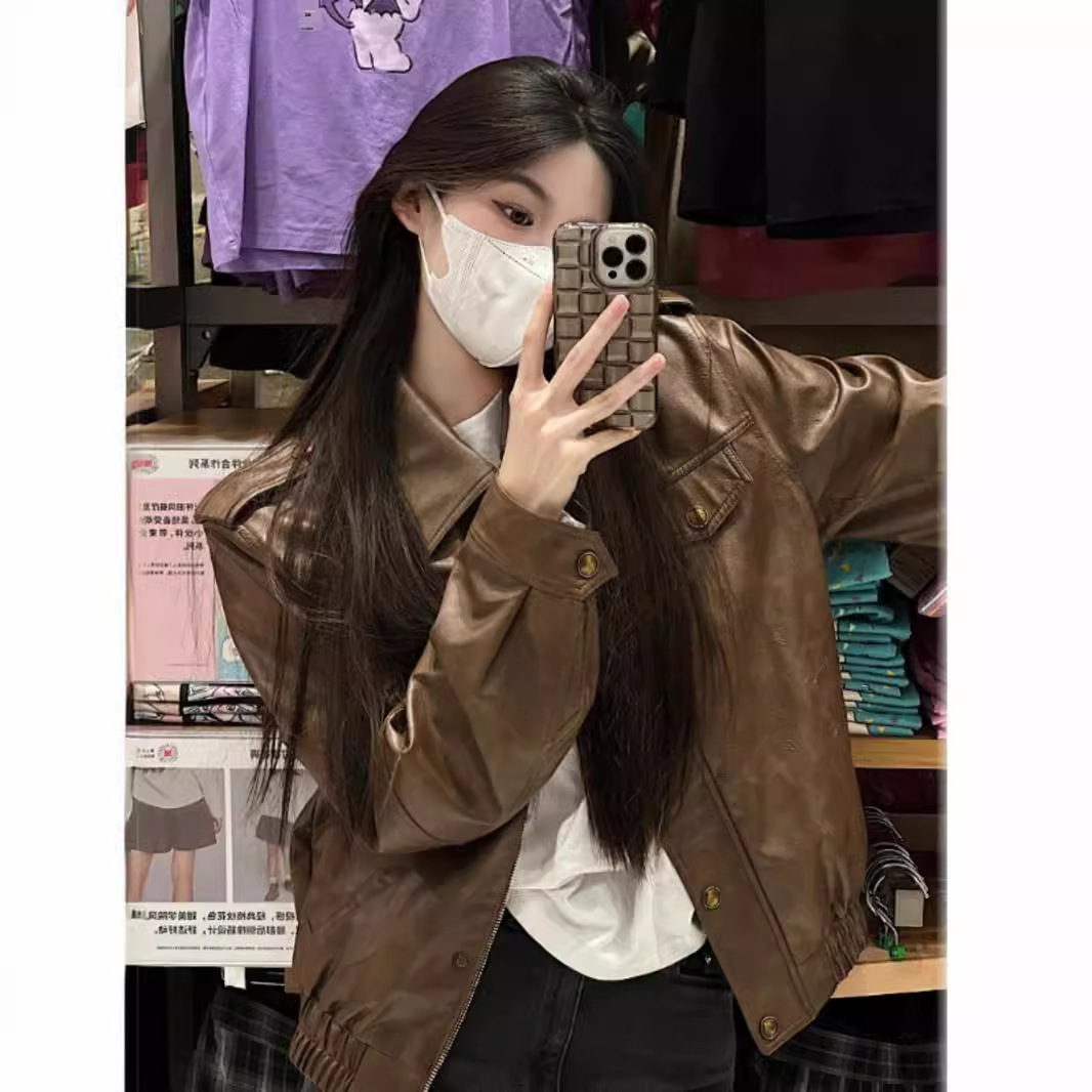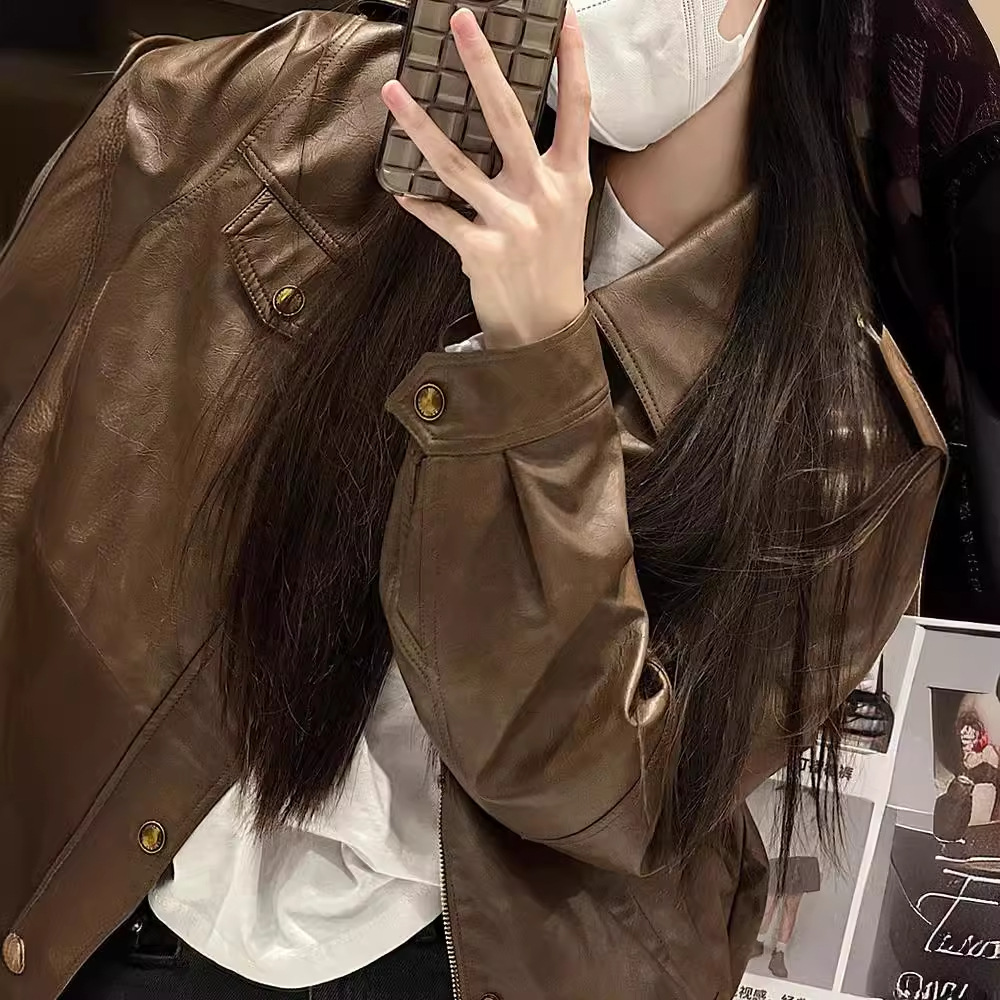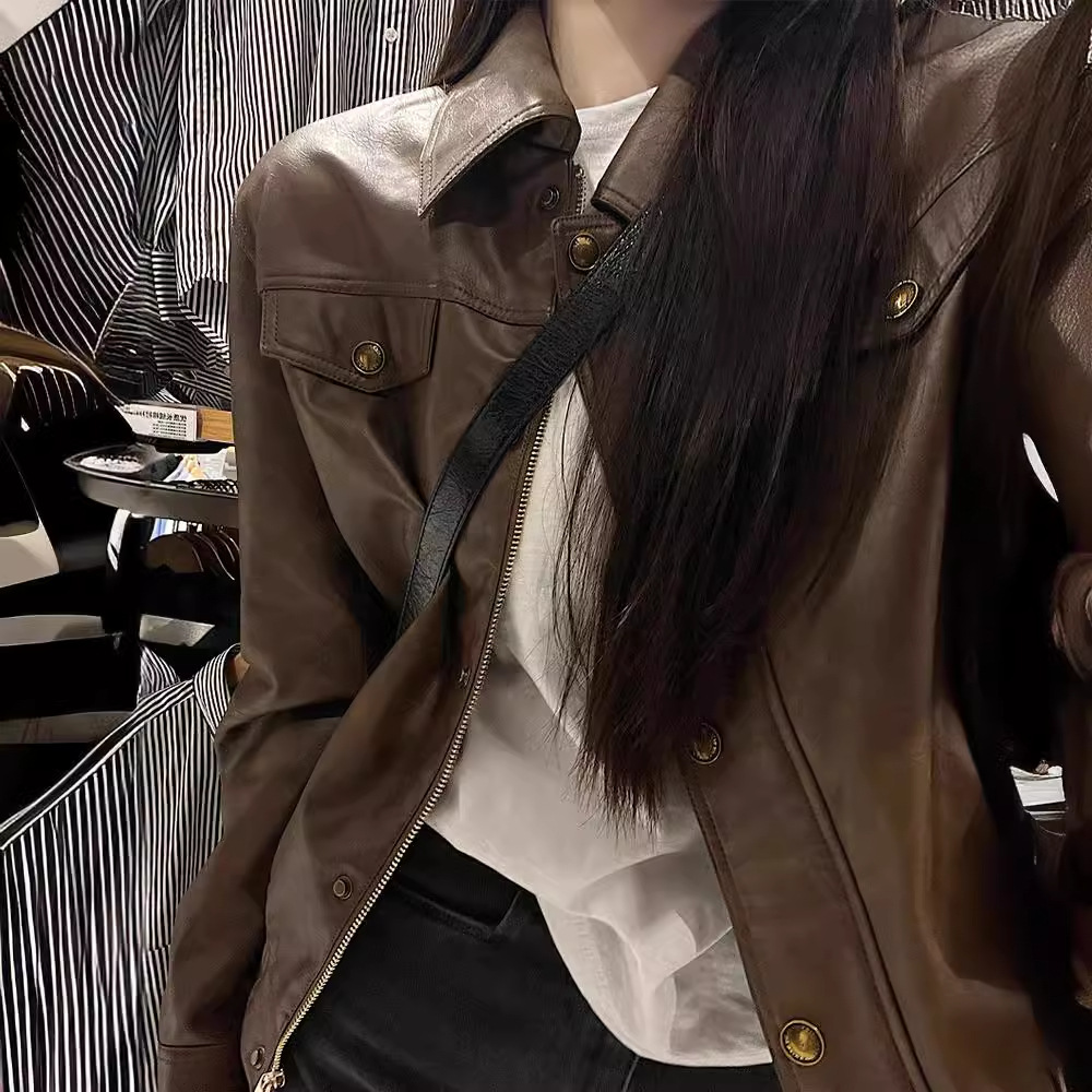 | nameOriginal | Short leather coat for women Spring and Autumn 2023 new American retro motorcycle jacket Brown Maillard wear |
