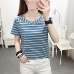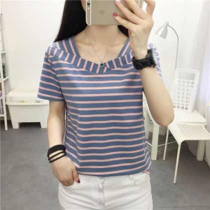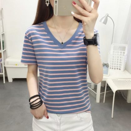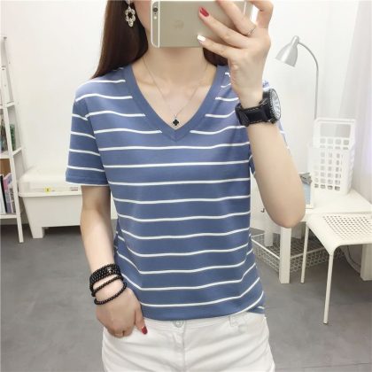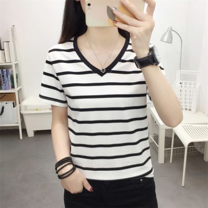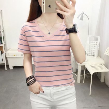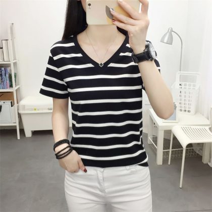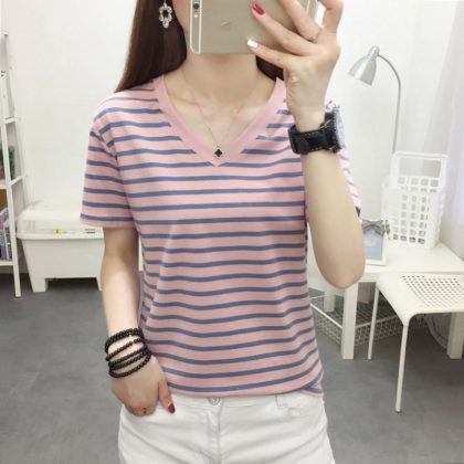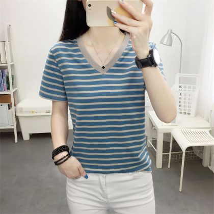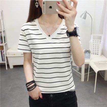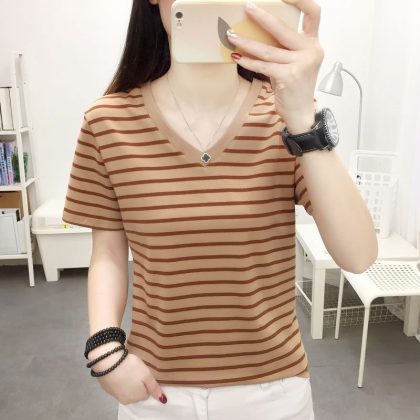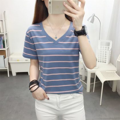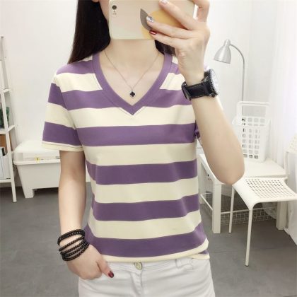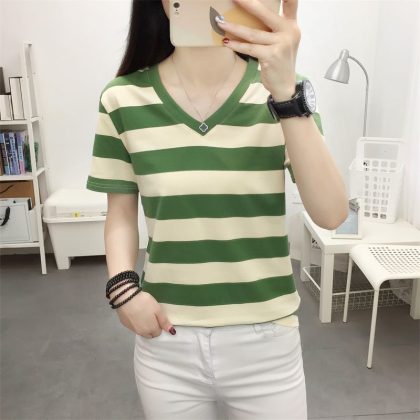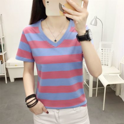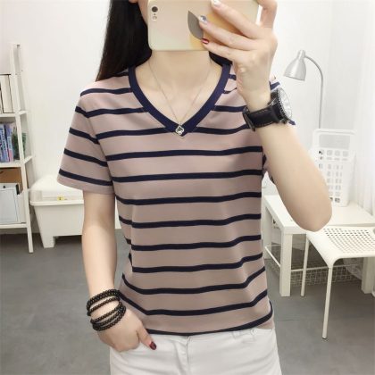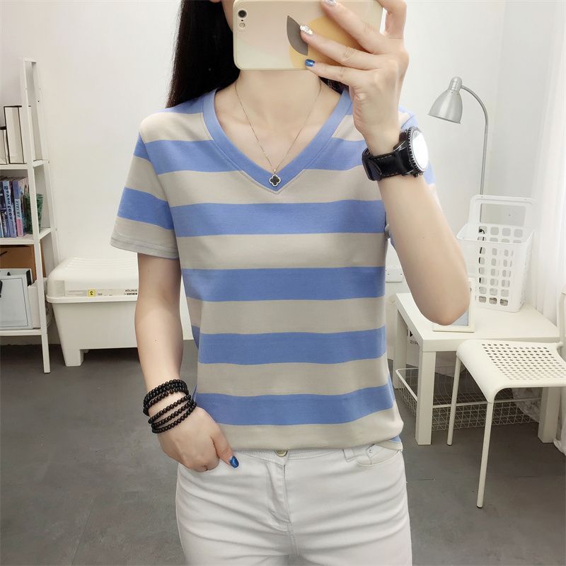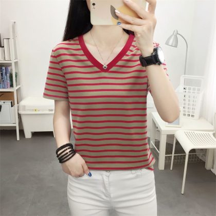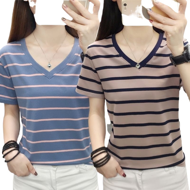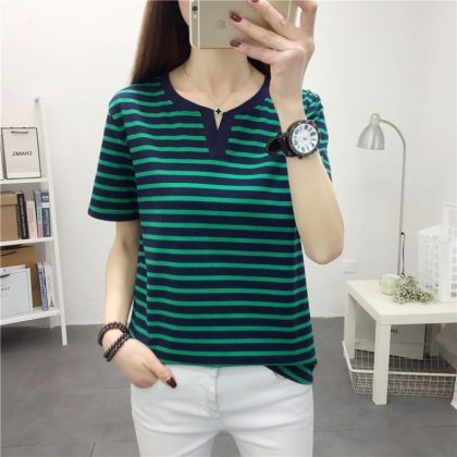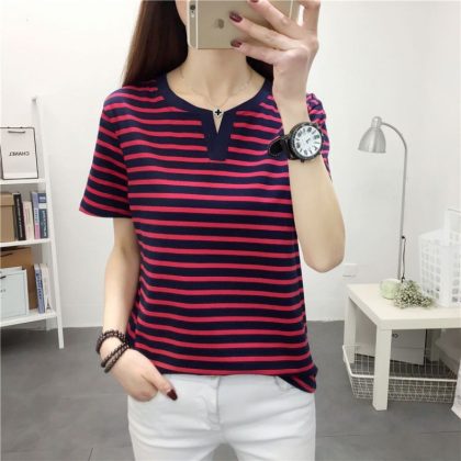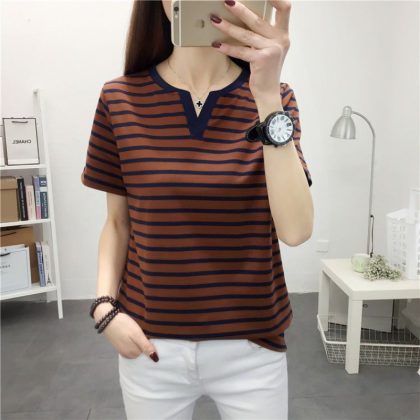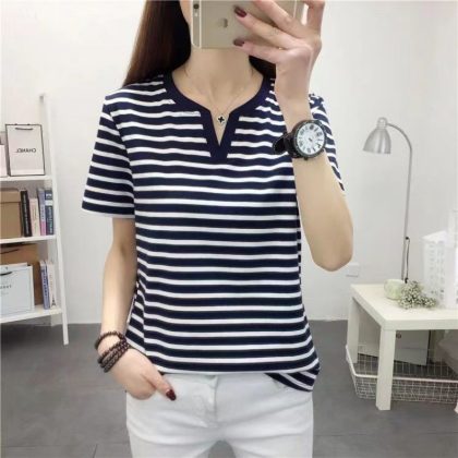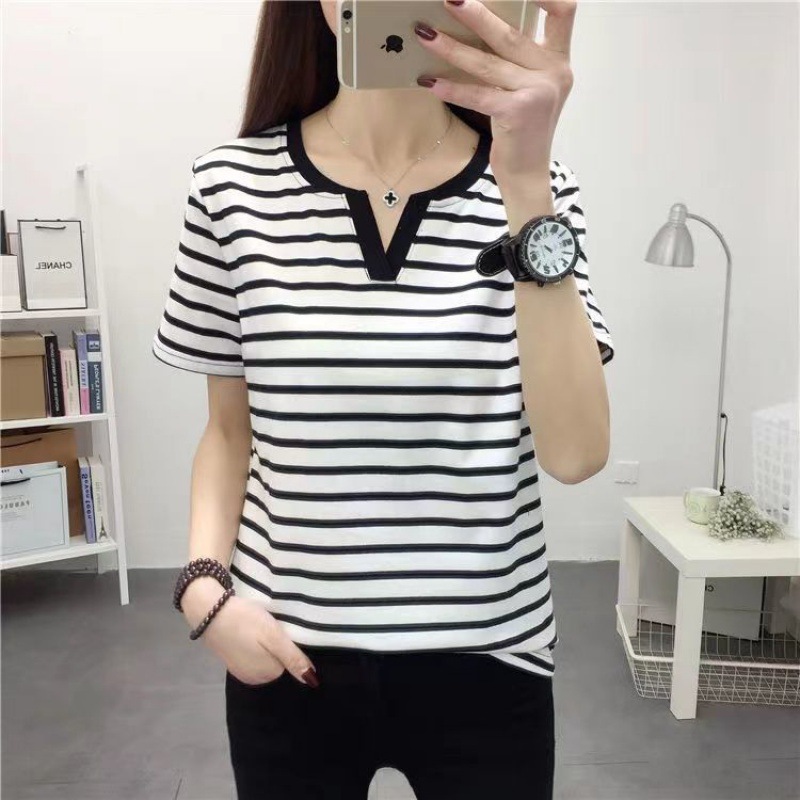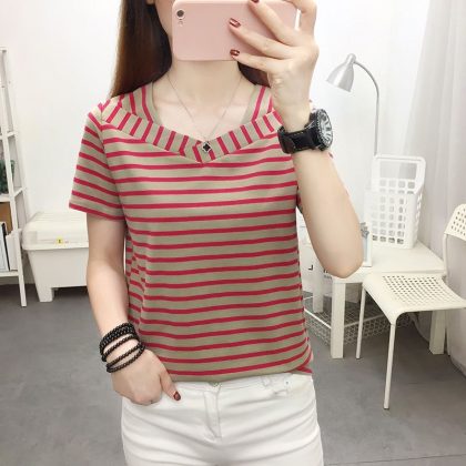 | nameOriginal | Short-Sleeve Shirt for Women's Mother Dress for Fat Sister Loose Slim Belly Covering Plus Size Large Size Striped Chicken Heart Collar Top |