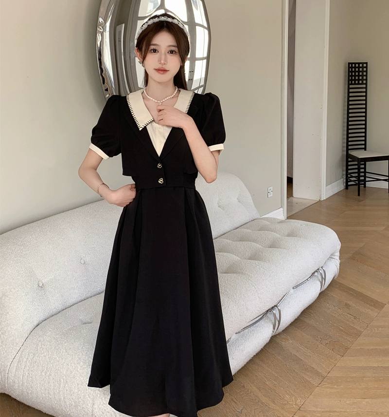 Short-sleeved Hepburn style little black dress for fat girls, fake two-piece drape