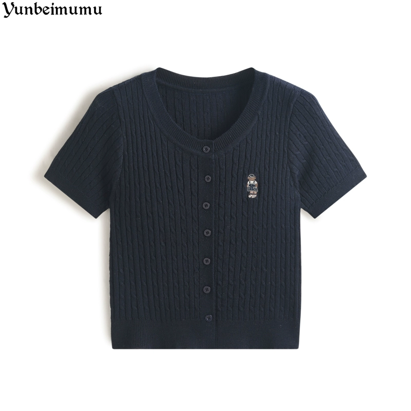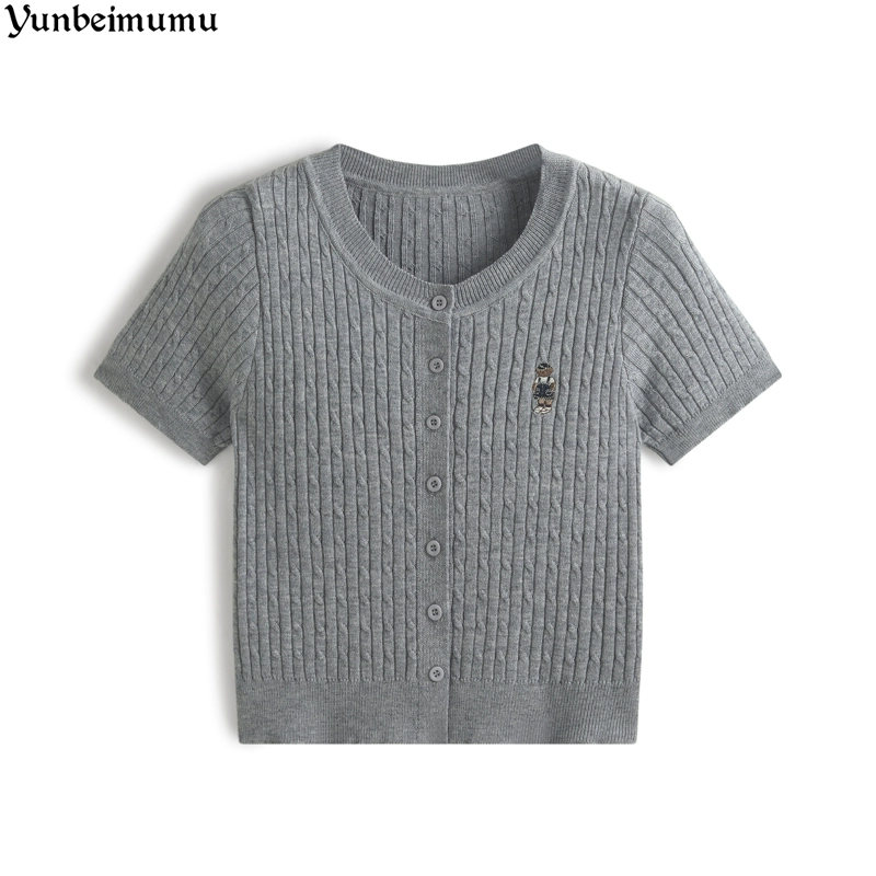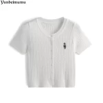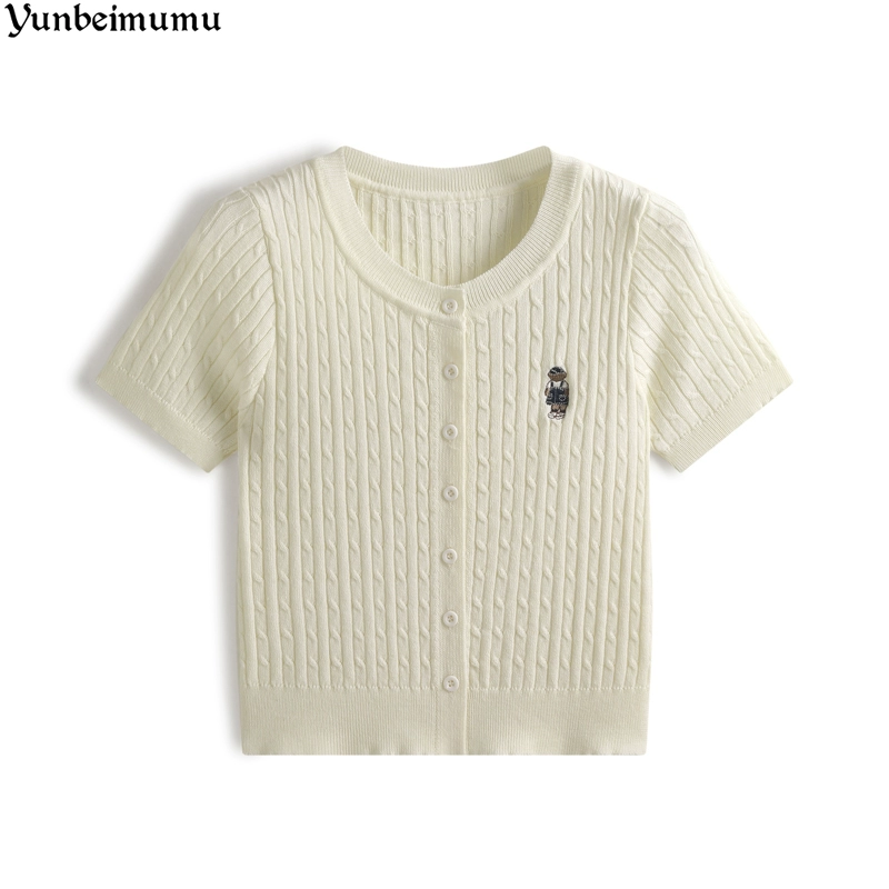 Short-sleeved summer round neck slim-fitting top with thin embroidery