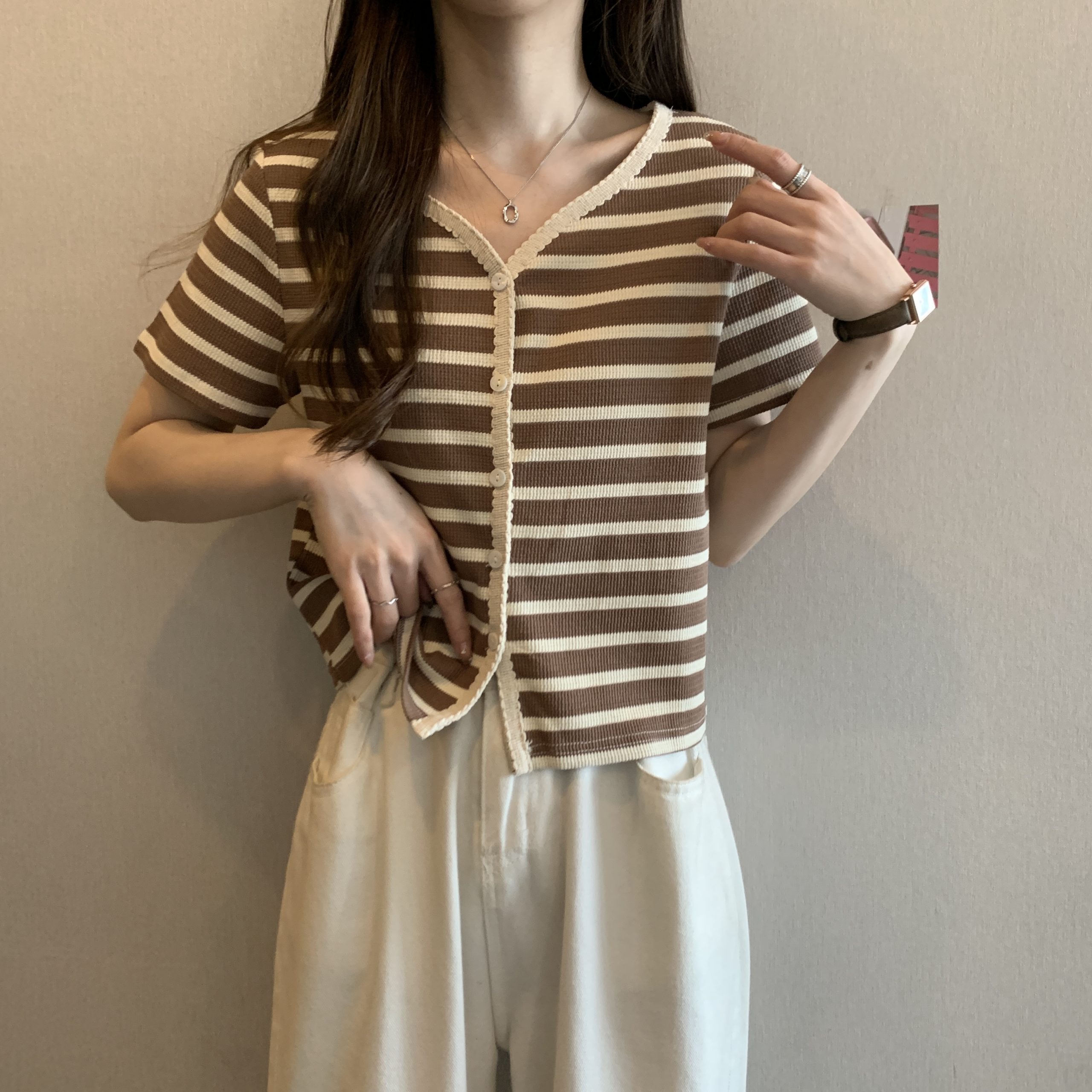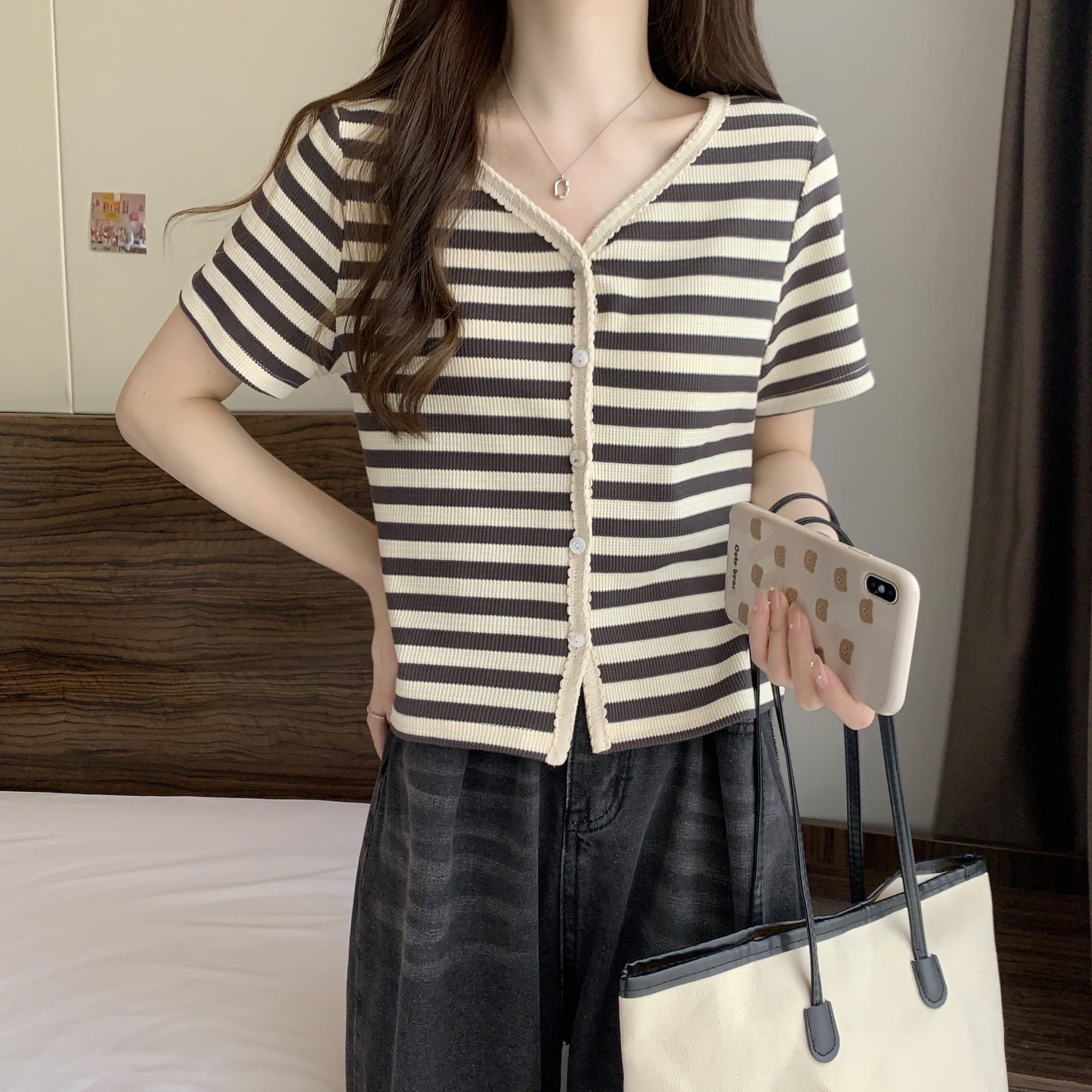 | nameOriginal | Short-sleeved women's 2024 summer new French collarbone V-neck shoulder T-shirt striped slimming short top |