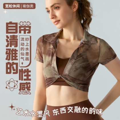 Short sports T-shirt women's thin print mesh yoga blouse short sleeve Pilates training fitness top