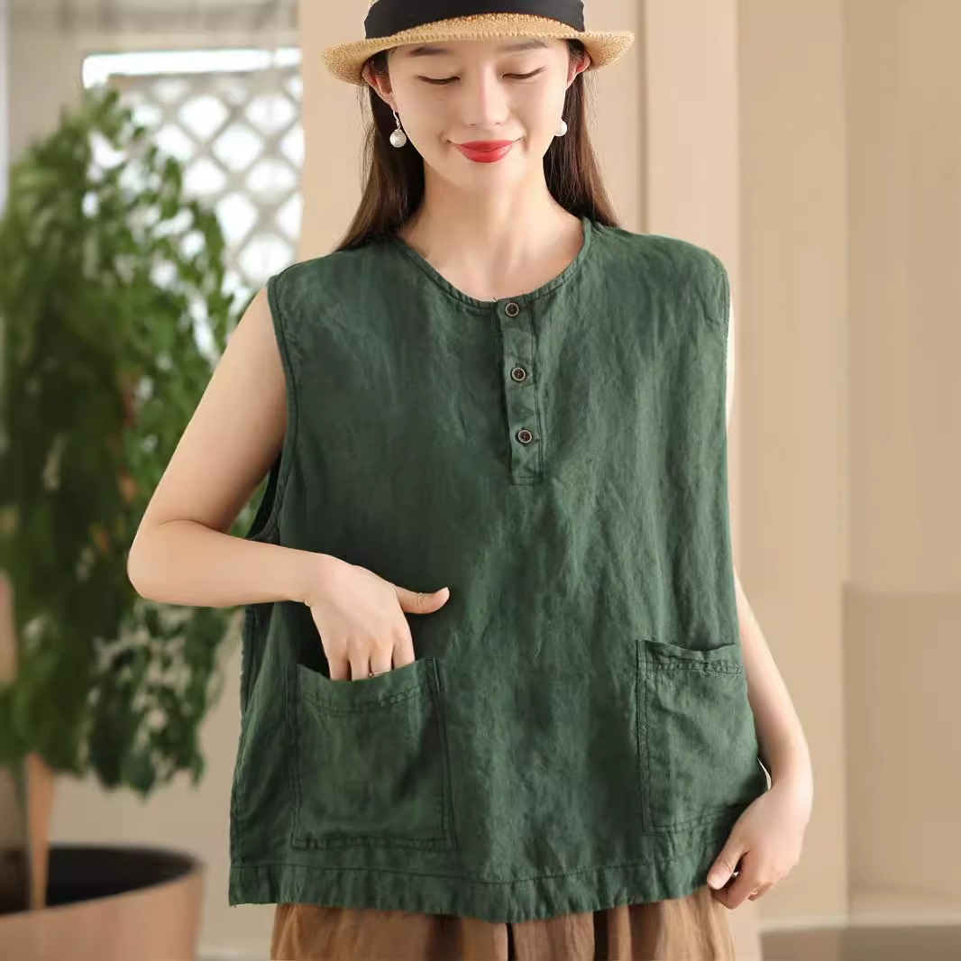 Shun Thick Pure Linen Vest Women's Top Line Pocket Round Neck Sleeveless Top Outer Wear Base Inner Summer