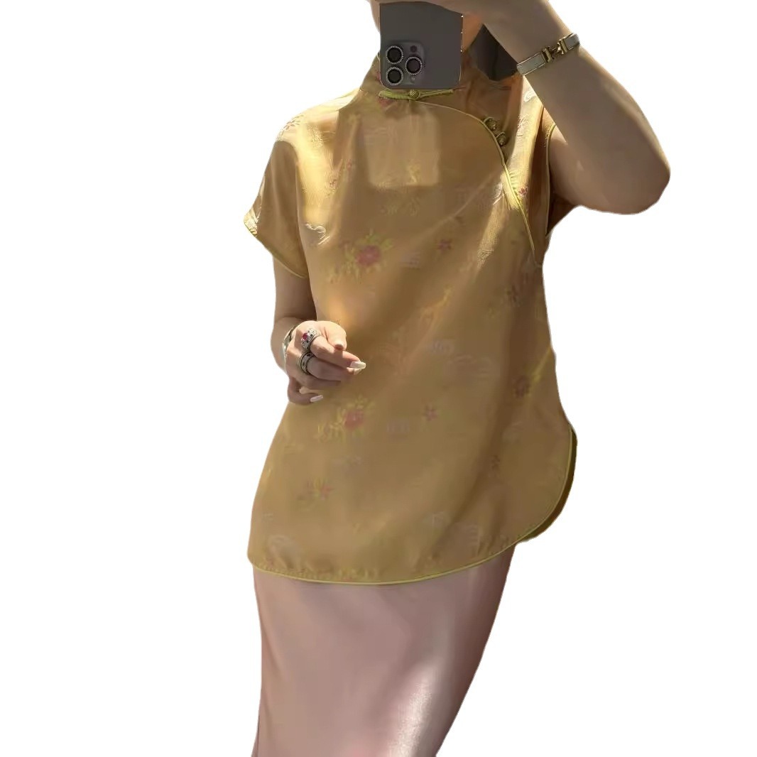 Silk Hetero New Chinese Style Vertical Collar Buckle Single-breasted National Style Retro Elegant Summer Short-sleeved Top