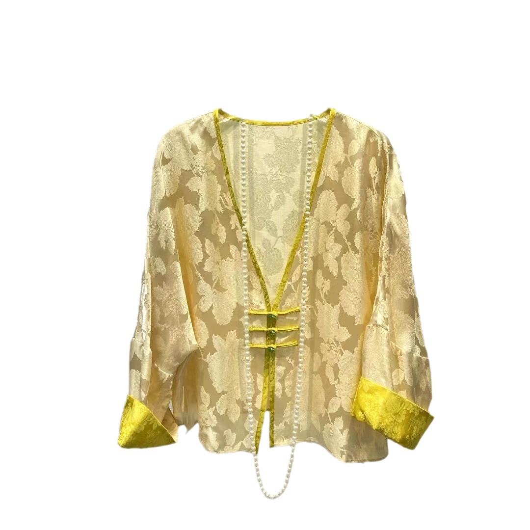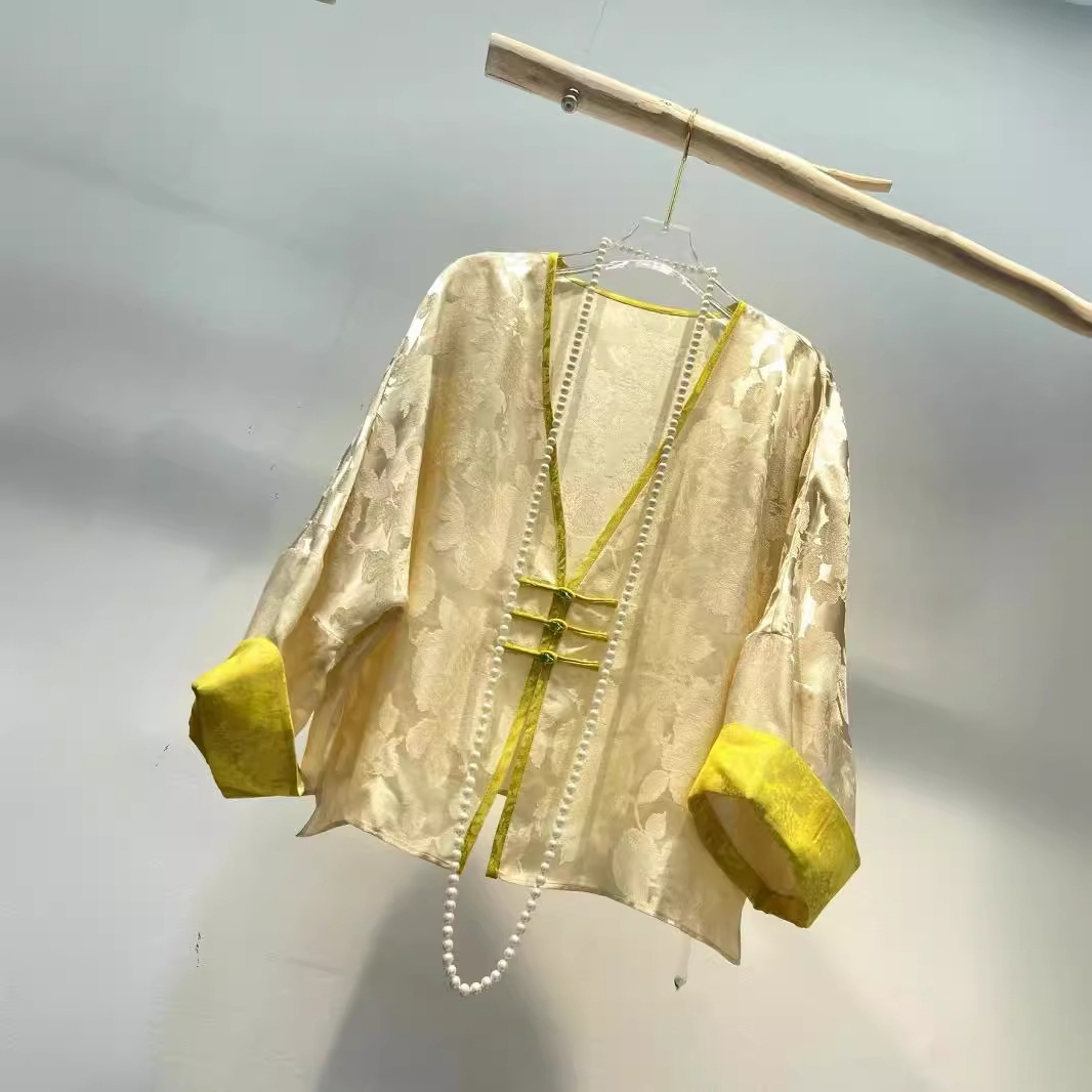 | nameOriginal | Silk V-Neck New Chinese Style Exquisite Buckle Single-breasted Buckle National Style Summer Seven-point Sleeve Sunscreen Breathable Top |