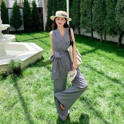 | nameOriginal | Simple Sleeveless Plaid jumpsuit Women's 2024 Summer New Design Sense Loose Slimming V-neck Wide-leg jumpsuit |