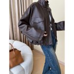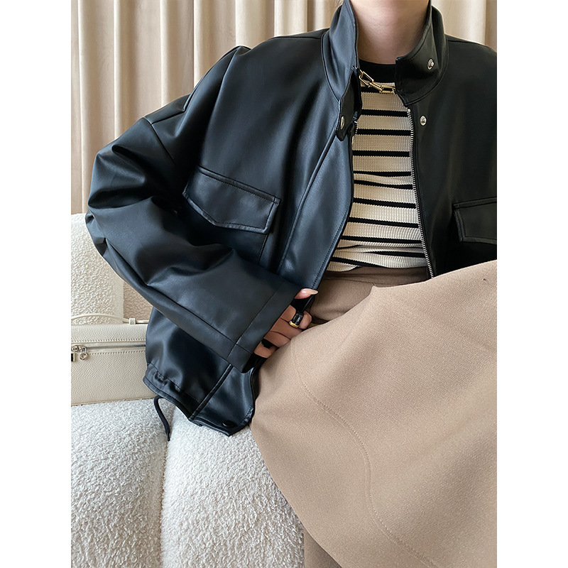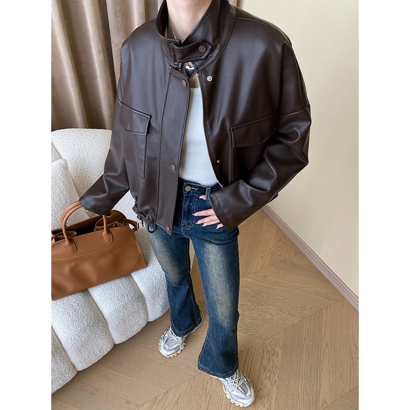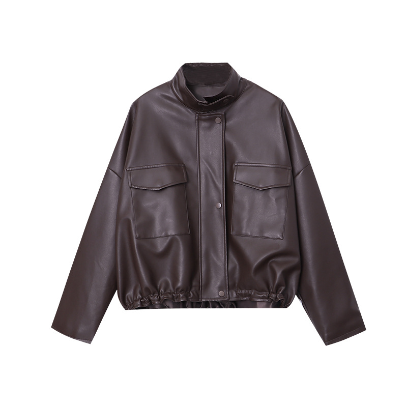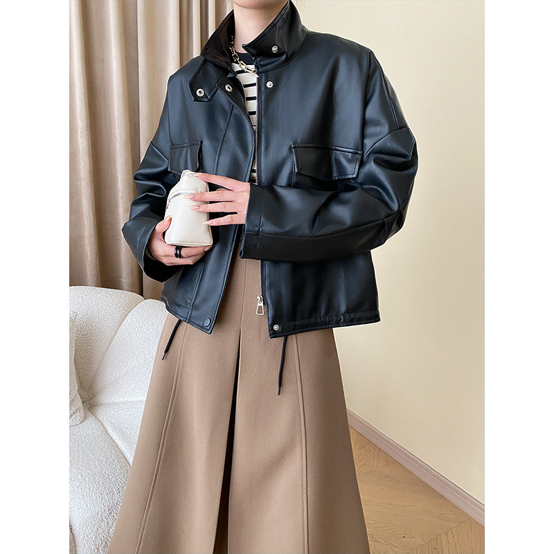 | nameOriginal | Sinan design double pocket casual stand collar drawstring workwear casual jacket leather coat SN4548 |