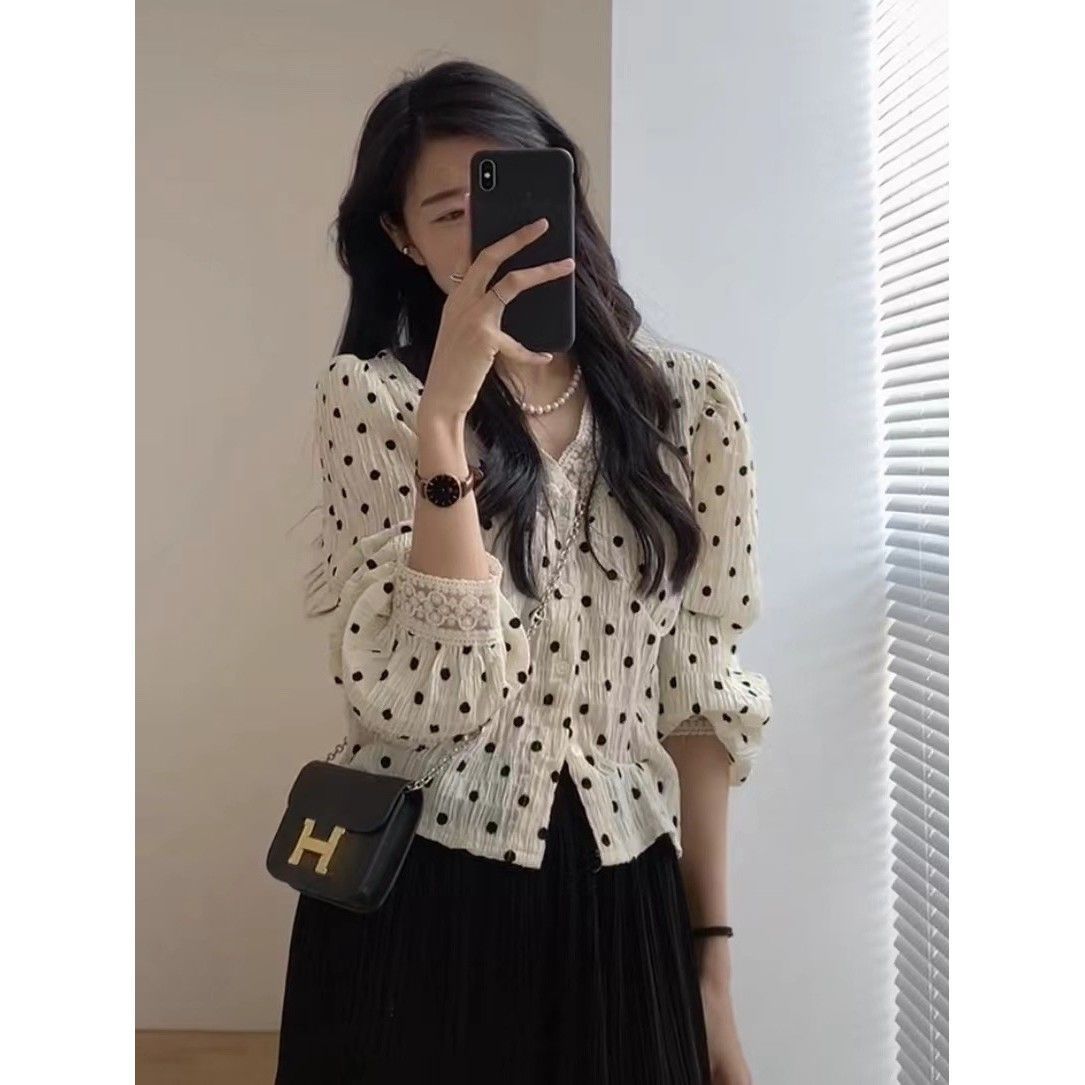 Single Piece/Retro Polka Dot Lace V-neck Elegant Style Shirt Women's Skirt Summer New Short Top