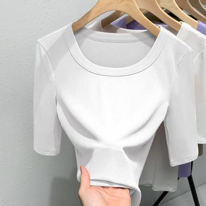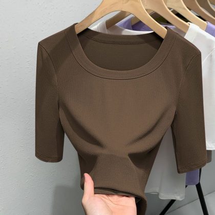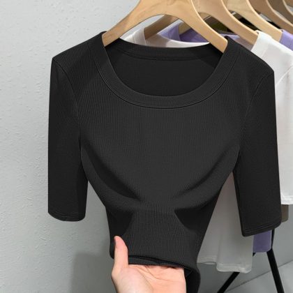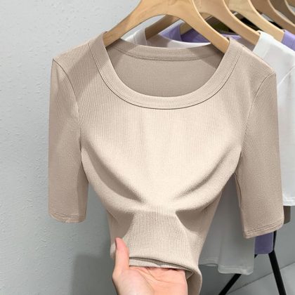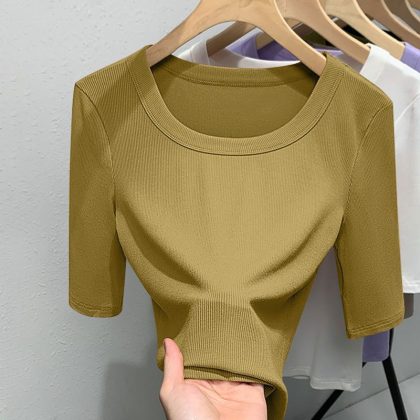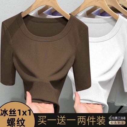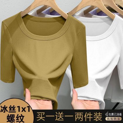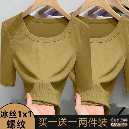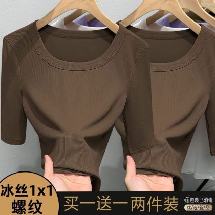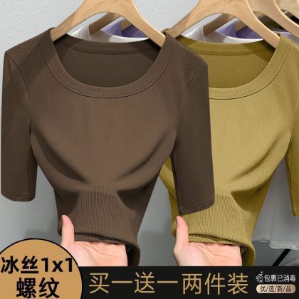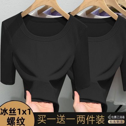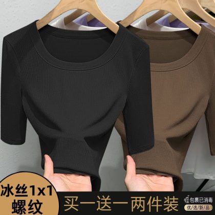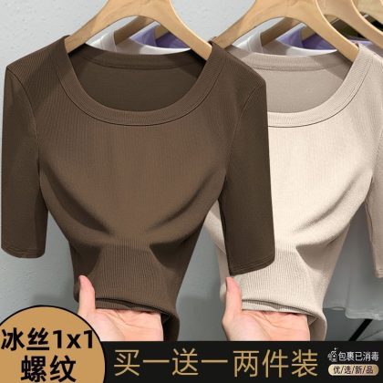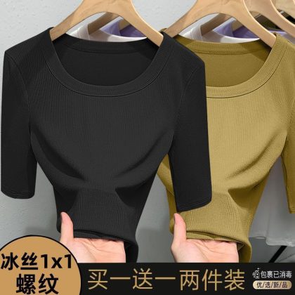| nameOriginal | Single/two-piece threaded slim solid color 5-sleeve T-shirt women's low crew neck top women's 24 new spring and summer |