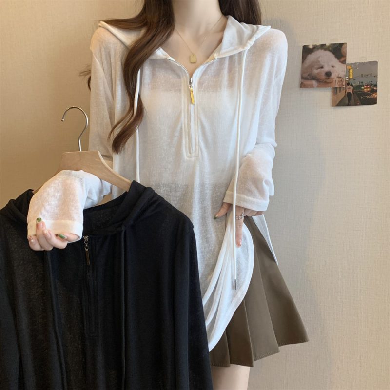 | nameOriginal | Slightly Chubby plus size Thin Blouse Sunscreen T-Shirt Women's Long-sleeved Loose Summer Slimming Black Hooded Mid-length Top |