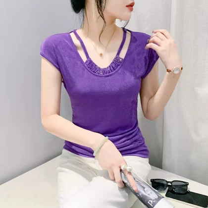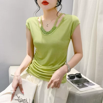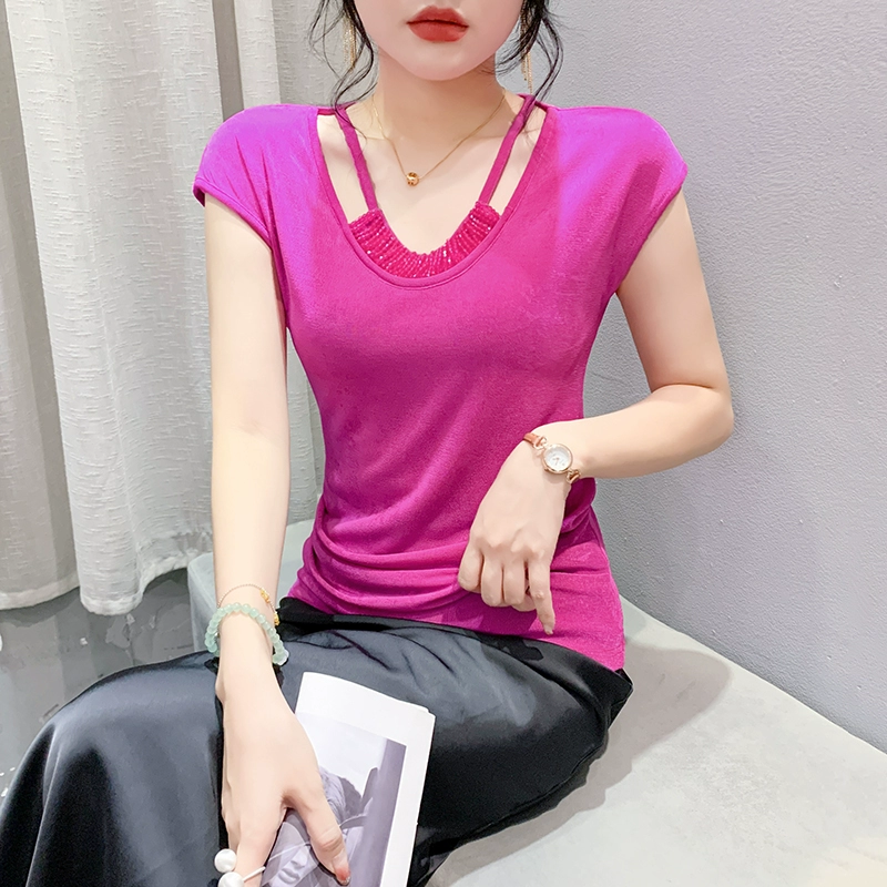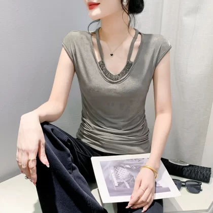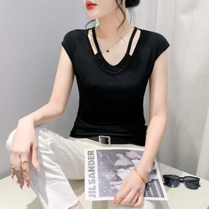 | nameOriginal | Slim-fitting beaded V-neck T-shirt European chic drapey summer dress |
