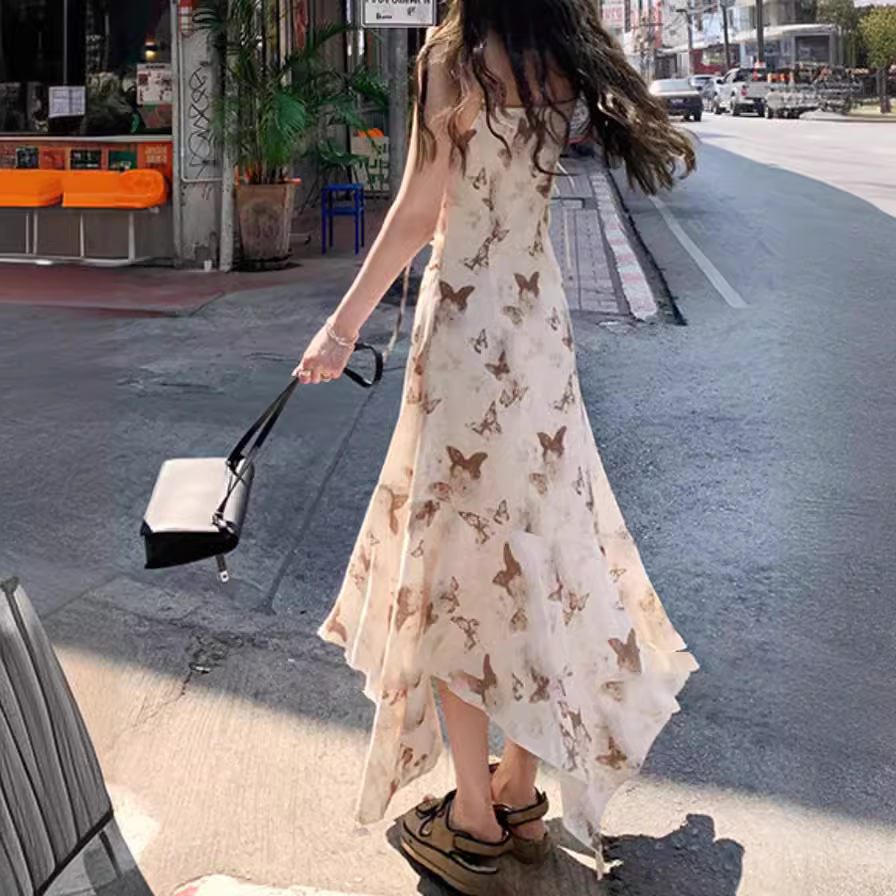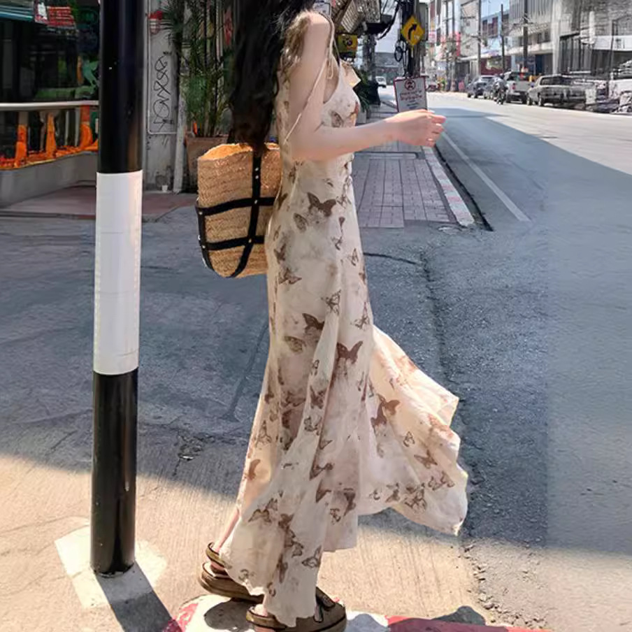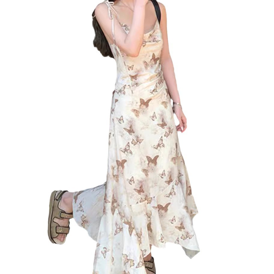 | nameOriginal | Sling Dress Women's Summer Swing Collar Elegant Niche Waist Irregular Butterfly Printed Holiday Fishtail Dress |