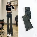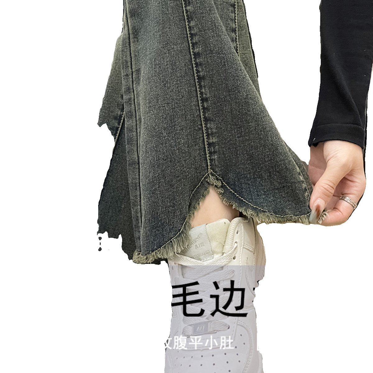 | nameOriginal | Small cough flared pants women's pants 2024 spring high waist belly covering slightly fat front slit tassel slightly pull Denim mop pants |