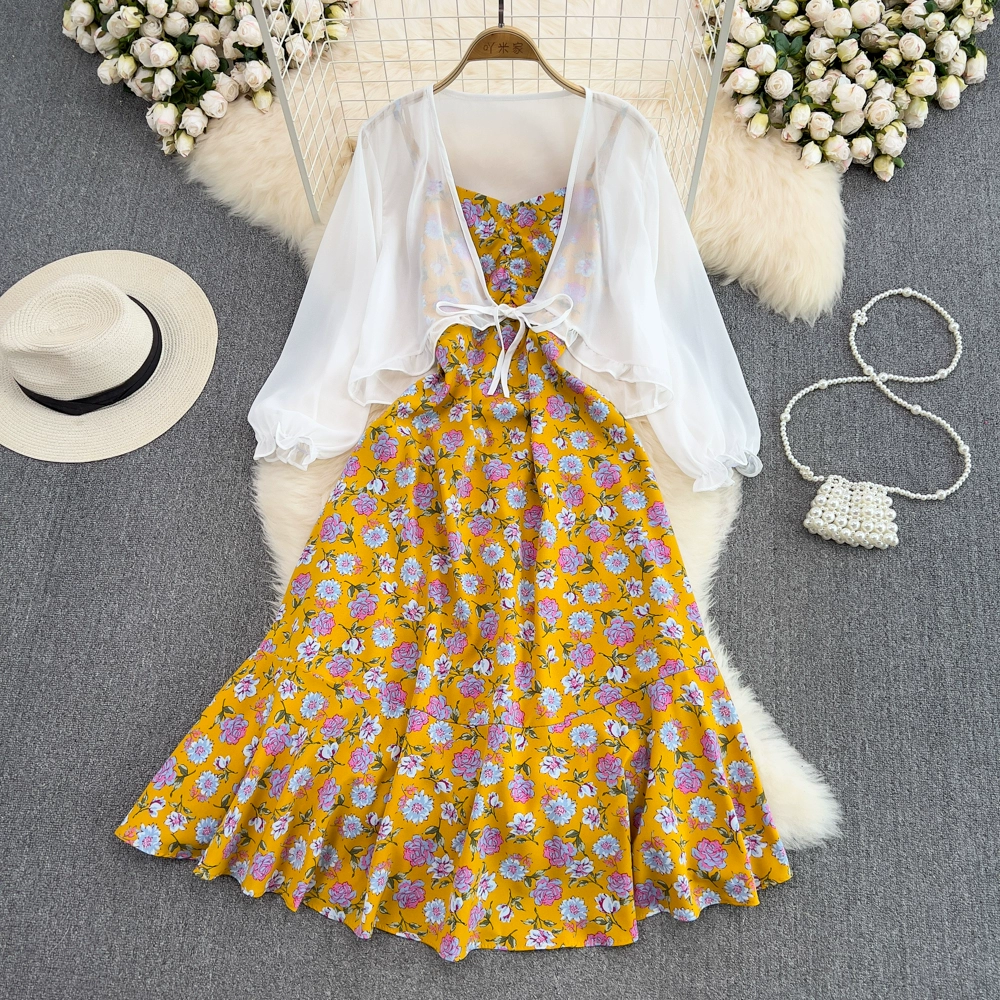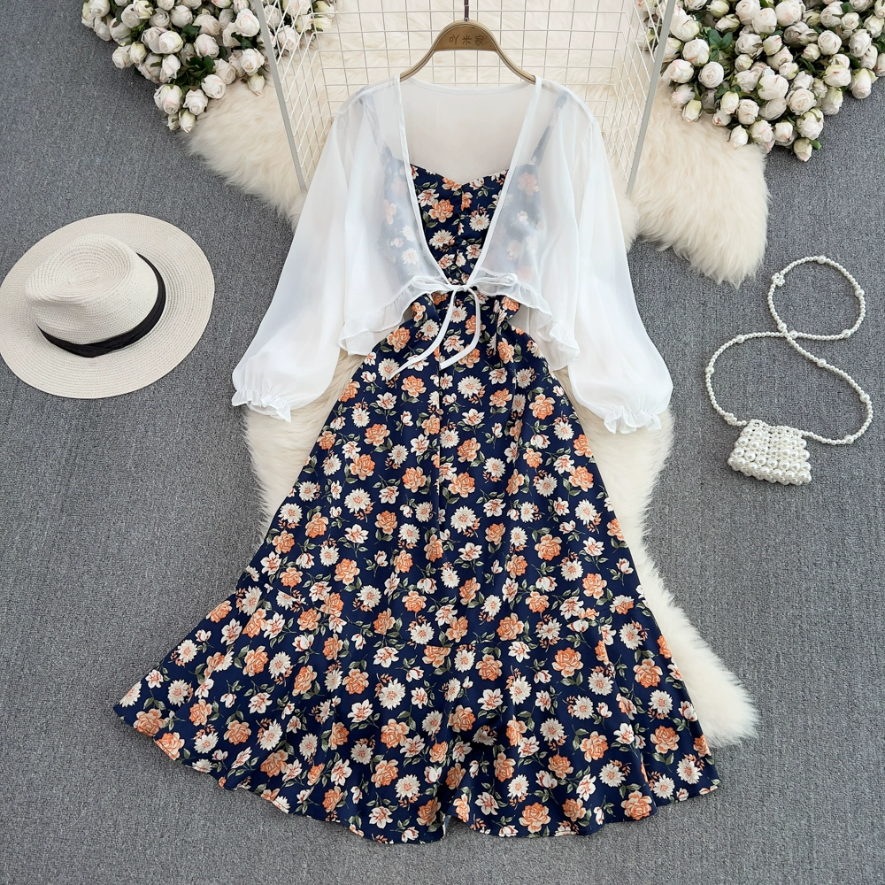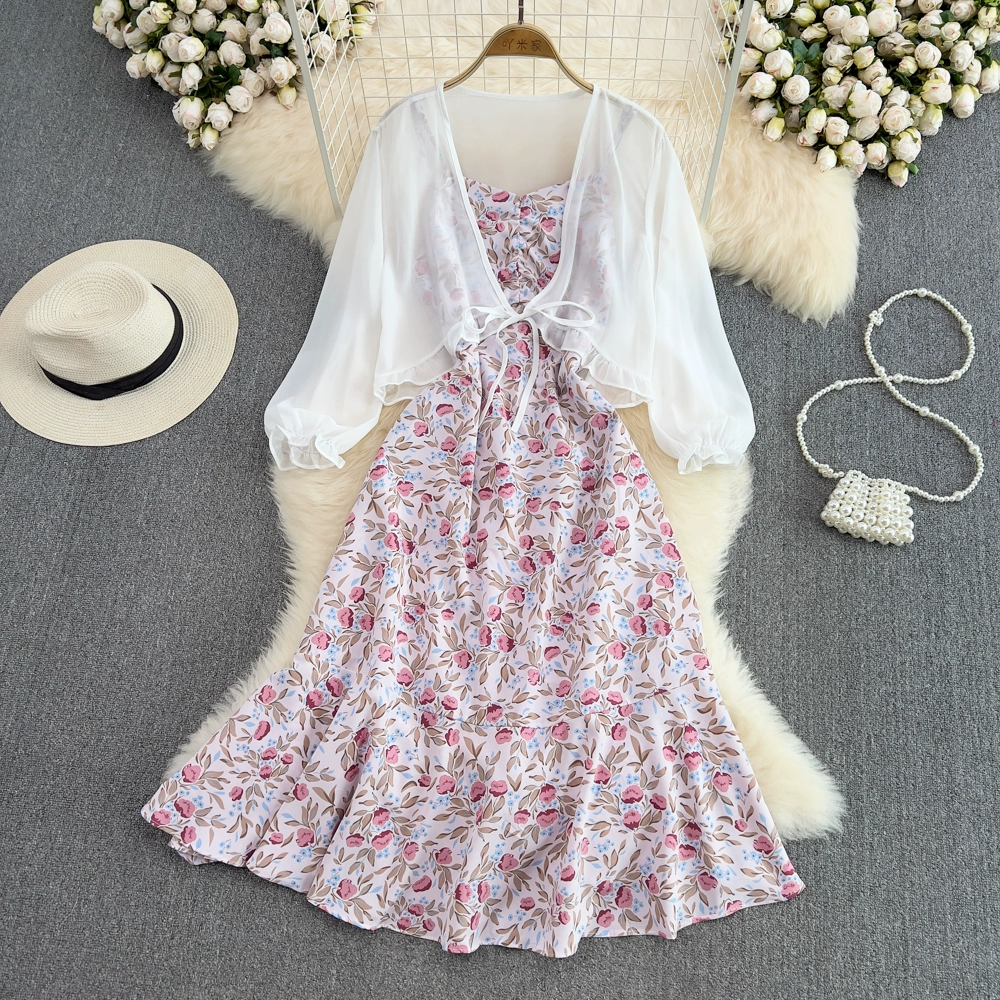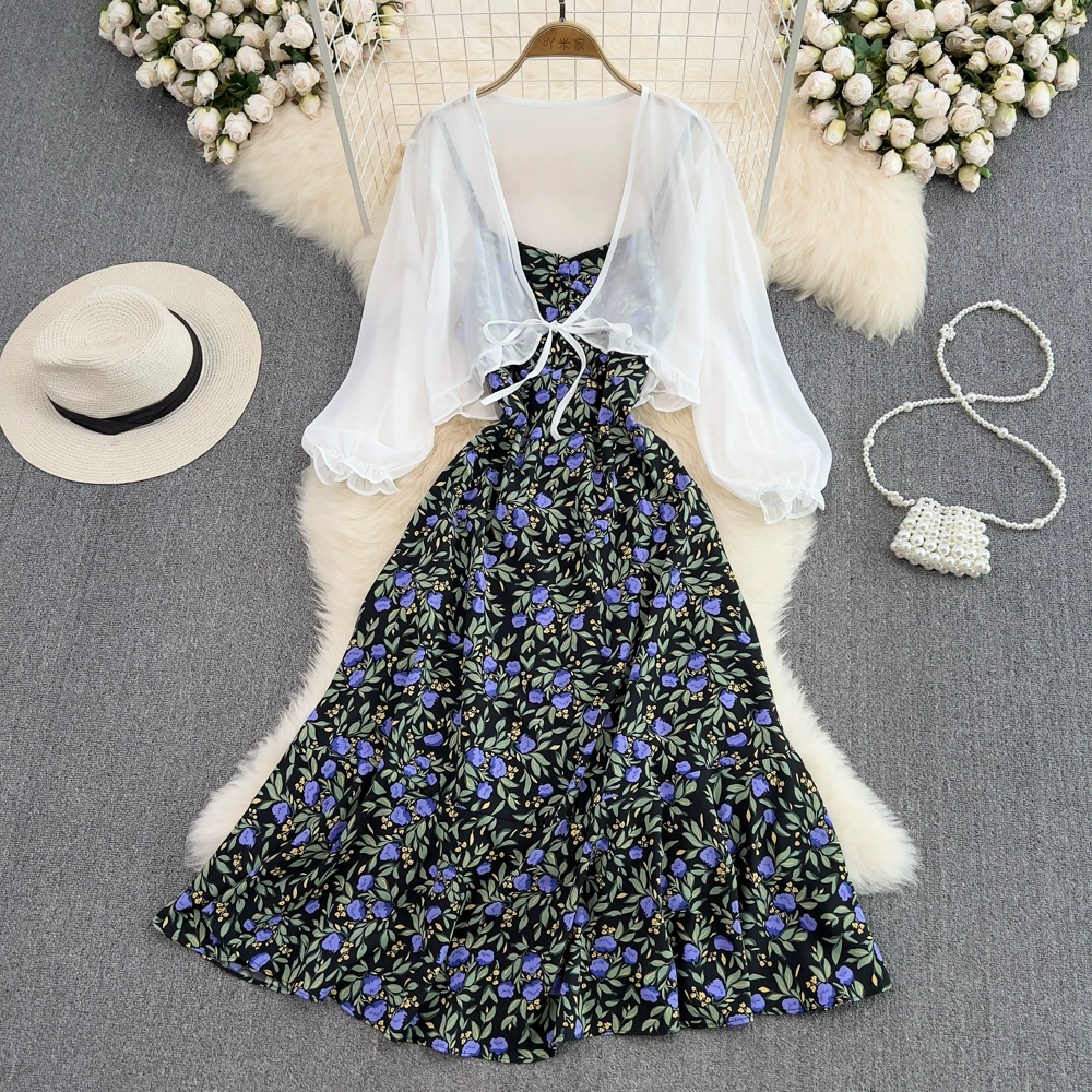 Small fresh backless dress chiffon floral suspender belt