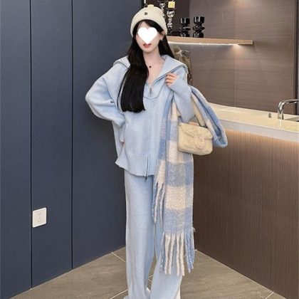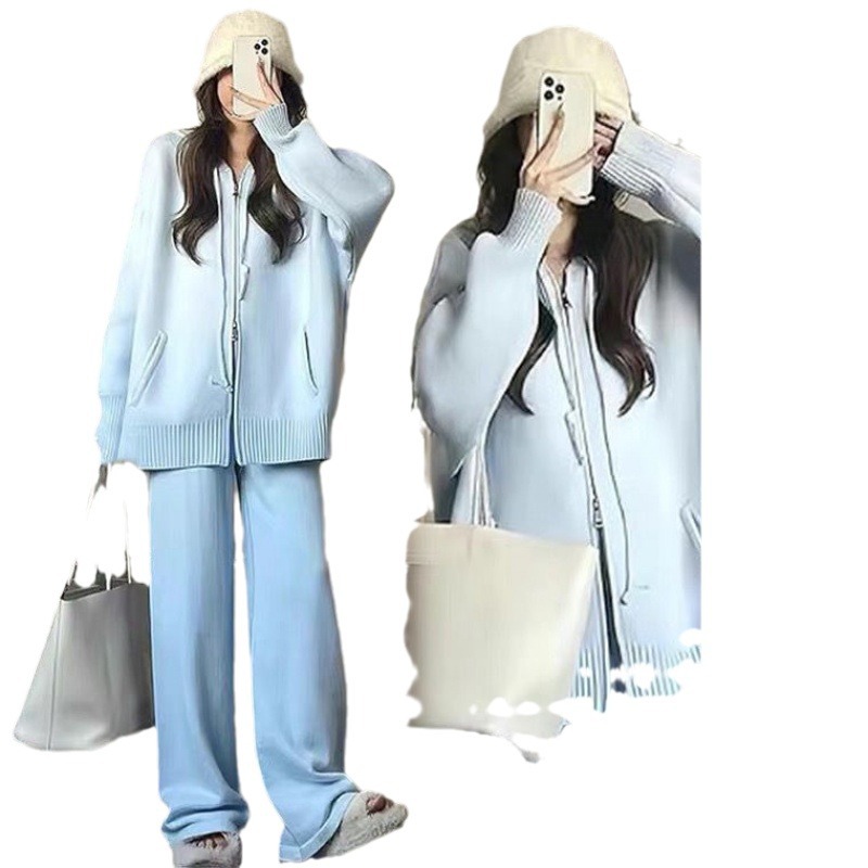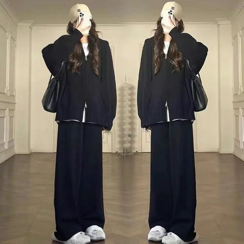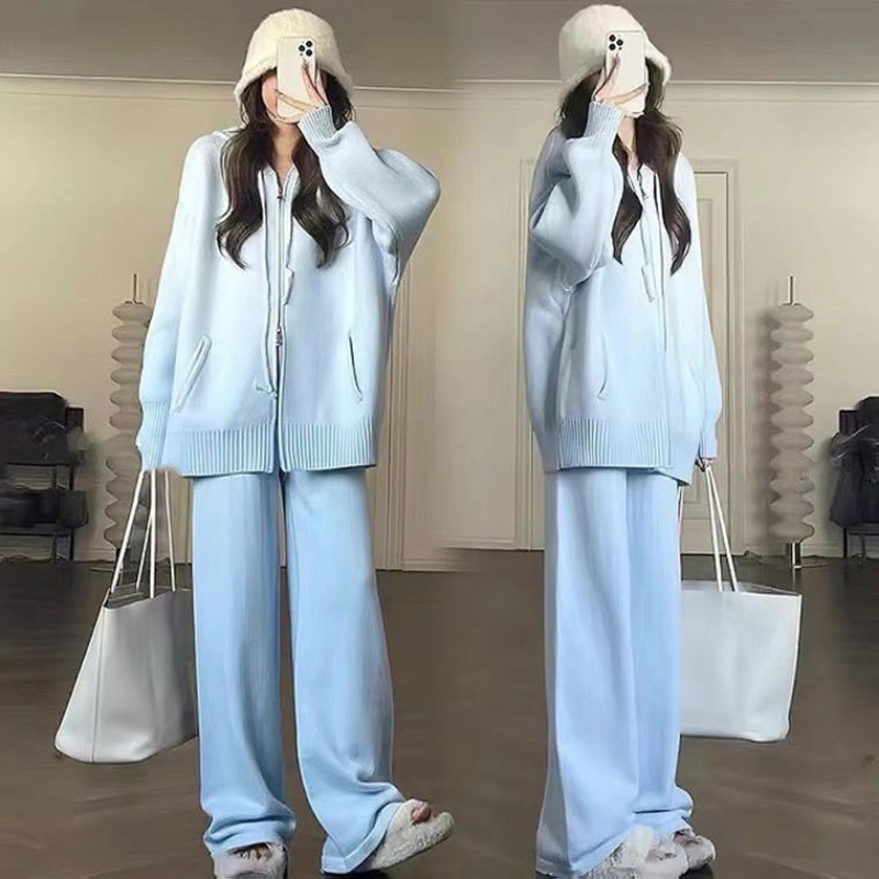 | nameOriginal | Small spring and autumn suit 2024 New knitted hooded sweater slimming wide leg pants loose casual two-piece suit |