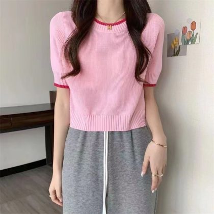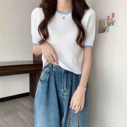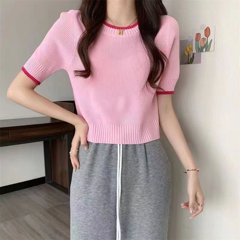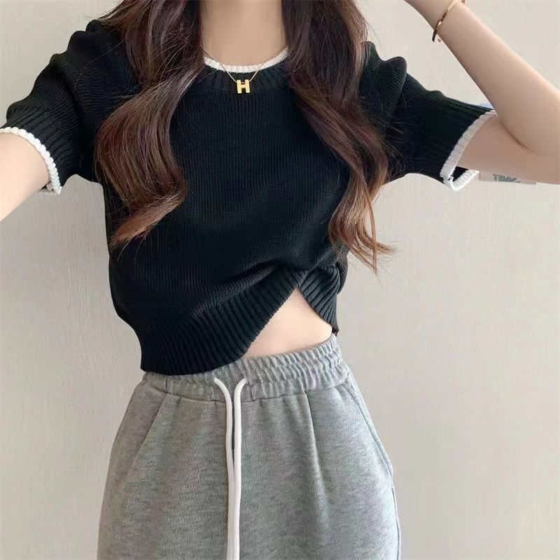 Small Waist Slimming Short Ice Silk Knitted Shirt Top Gentle Wind Contrast Color Shoulder Short-sleeved T-shirt for Women in Summer
