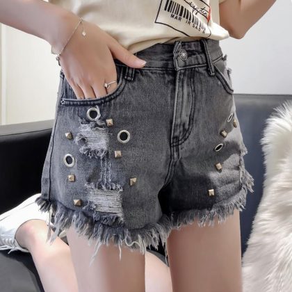 | nameOriginal | Smoke Grey High Waist Denim Shorts Women's Summer 2024 Korean Style New Arrival Rivet Ripped Edge A- Shaped Wide-Leg Hot Pants |