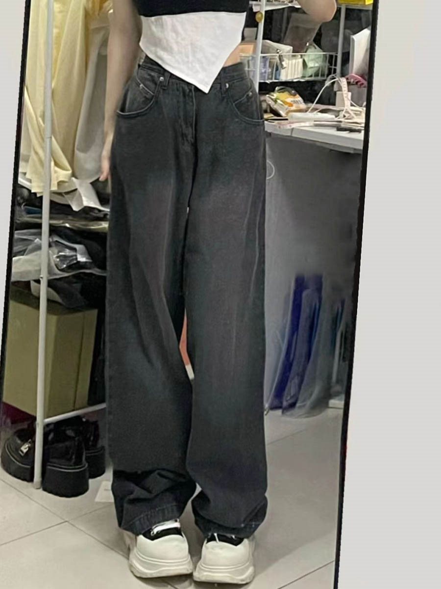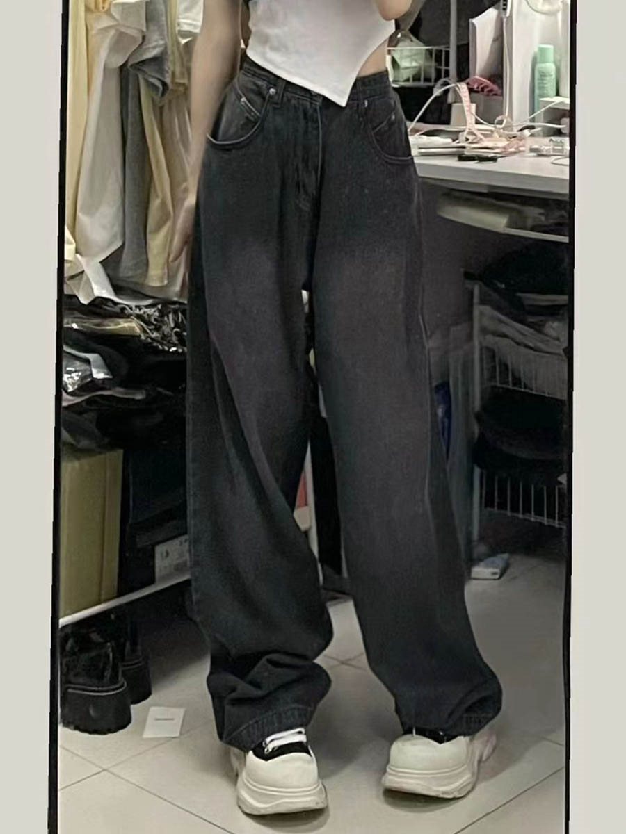 Smoke Grey Jeans Women's Straight High Waist Autumn plus size chubby girl Hip Covering Slimming Pear Figure Wide Leg Pants