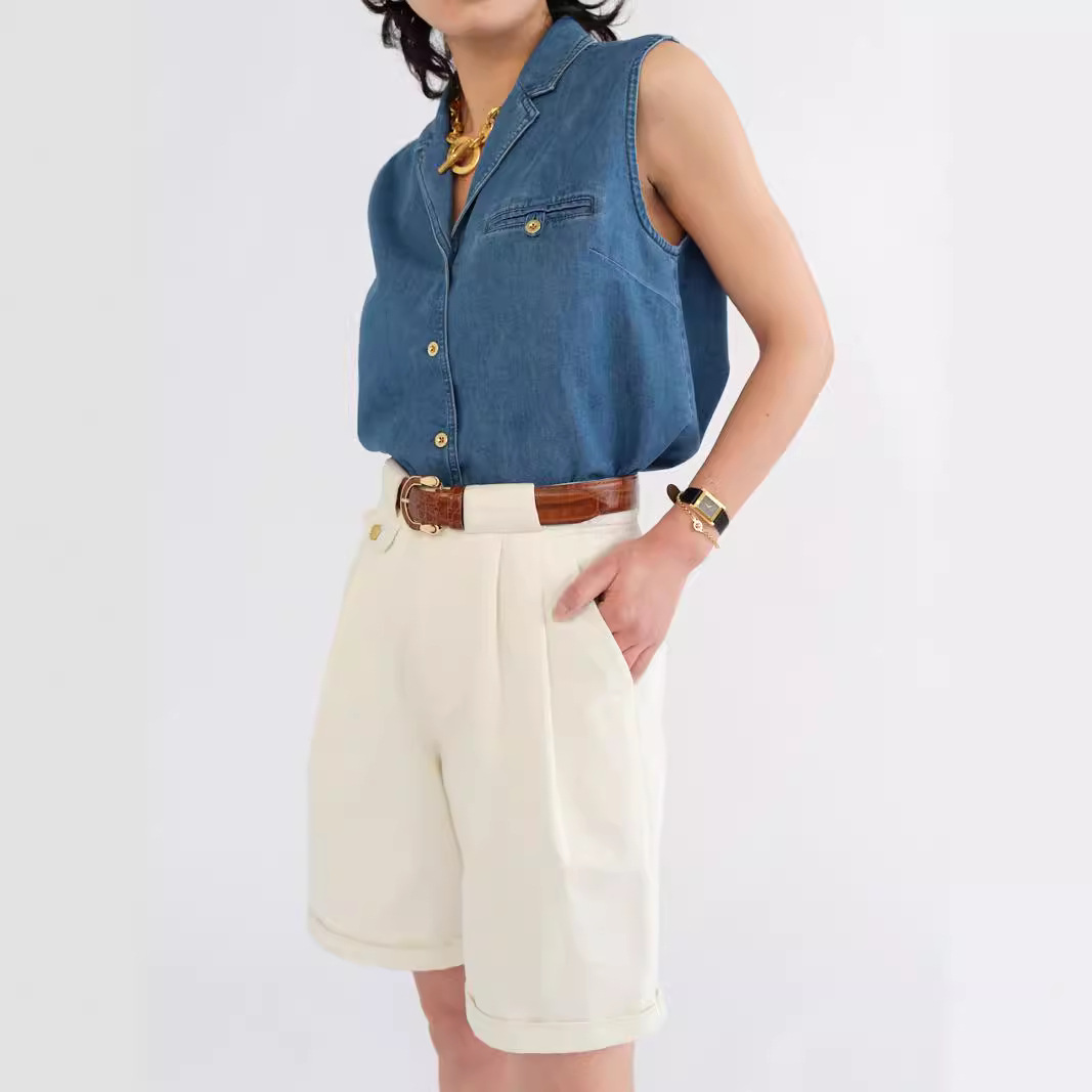 سترة من قماش الدنيم الناعم ذو الزاوية اليمنى والكتف مغسولة بدون أكمام من قماش الدنيم الصيفي
